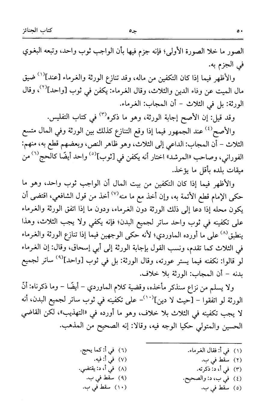 والأصح عند الجمهور فيما إذا وقع التنازع كذلك بين الورثة وفي المال متسع الثلاث- أن المجاب: الداعي إلى الثلاث، وهو ظاهر النص، وبعضهم قطع به، منهم: الفوراني، وصاحب "المرشد" اختار أنه يكفن في [ثوب] واحد أيضاً كالحج من ميقات بلده بأقل ما يؤخذ.