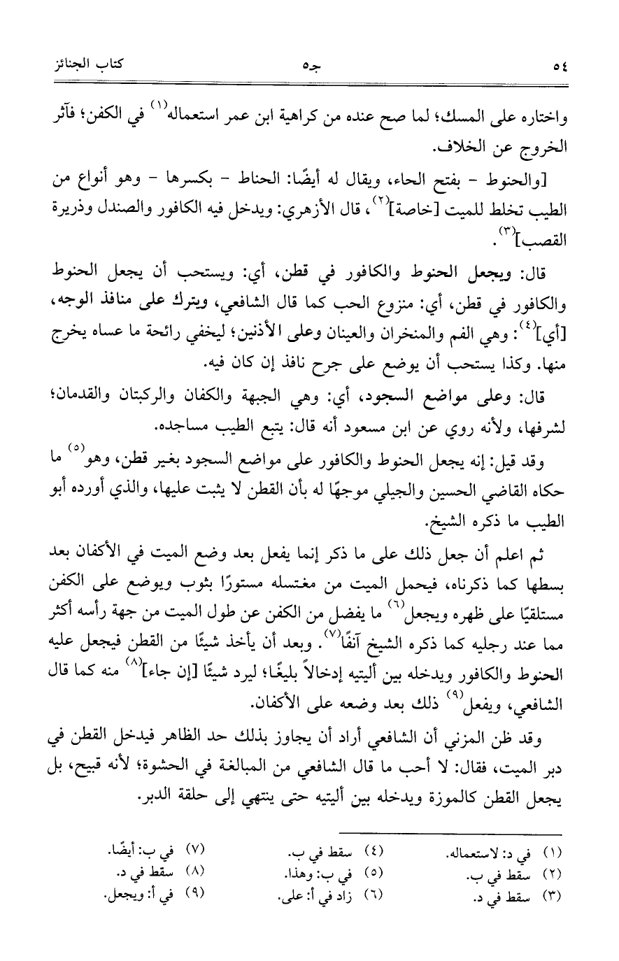 قال: ويجعل الحنوط والكافور في قطن، أي: ويستحب أن يجعل الحنوط والكافور في قطن، أي: منزوع الحب كما قال الشافعي، ويترك على منافذ الوجه، [أي]: وهي الفم والمنخران والعينان وعلى الأذنين؛ ليخفي رائحة ما عساه يخرج منها. وكذا يستحبأن يوضع على جرح نافذ إن كان فيه.