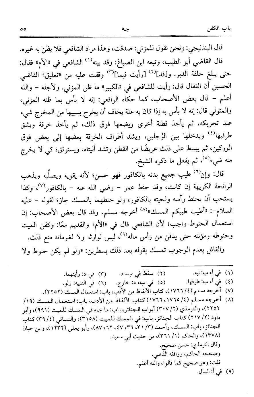 والقائل بعدم الوجوب تمسك بقوله بعد ذلك بسطرين: "ولو لم يكن حنوط ولا