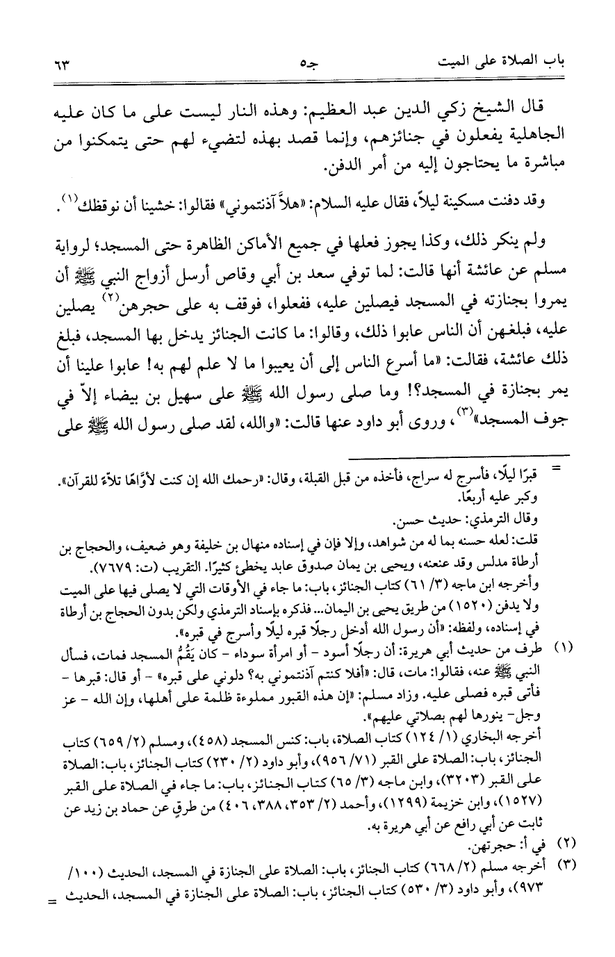 ولم ينكر ذلك، وكذا يجوز فعلها في جميع الأماكن الظاهرة حتى المسجد؛ لرواية مسلم عن عائشة أنها قالت: لما توفي سعد بن أبي وقاص أرسل أزواج النبي - صلى الله عليه وسلم - أن يمروا بجنازته في المسجد فيصلين عليه، ففعلوا، فوقف به على حجرهن يصلين عليه، فبلغهن أن الناس عابوا ذلك، وقالوا: ما كانت الجنائز يدخل بها المسجد، فبلغ ذلك عائشة، فقالت: "ما أسرع الناس إلى أن يعيبوا ما لا علم لهم به! عابوا علينا أن يمر بجنازة في المسجد؟! وما صلى رسول - صلى الله عليه وسلم - على سهيل بن بيضاء إلا في جوف المسجد"، وروى أبو داود عنها قالت: "والله، لقد صلى رسول الله - صلى الله عليه وسلم - على