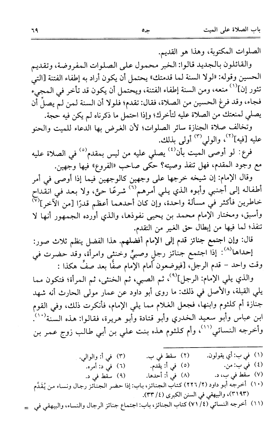 والذي يلي الإمام: الرجل] ثم الصبي، ثم الخنثى، ثم المرأة؛ فتكون مما يلي القبلة، والأصل في ذلك: ما روى أبو داود عن عمار مولى الحارث أنه شهد جنازة أم كلثوم وابنها، فجعل الغلام مما يلي الإمام، فأ، كرت ذلك، وفي القوم ابن عباس وأبو سعيد الخدري وأبو قتادة وابو هريرة، فقالوا: هذه السنة. وأخرجه النسائي، وأم كلثوم هذه بنت علي بن أبي طالب زوج عمر بن