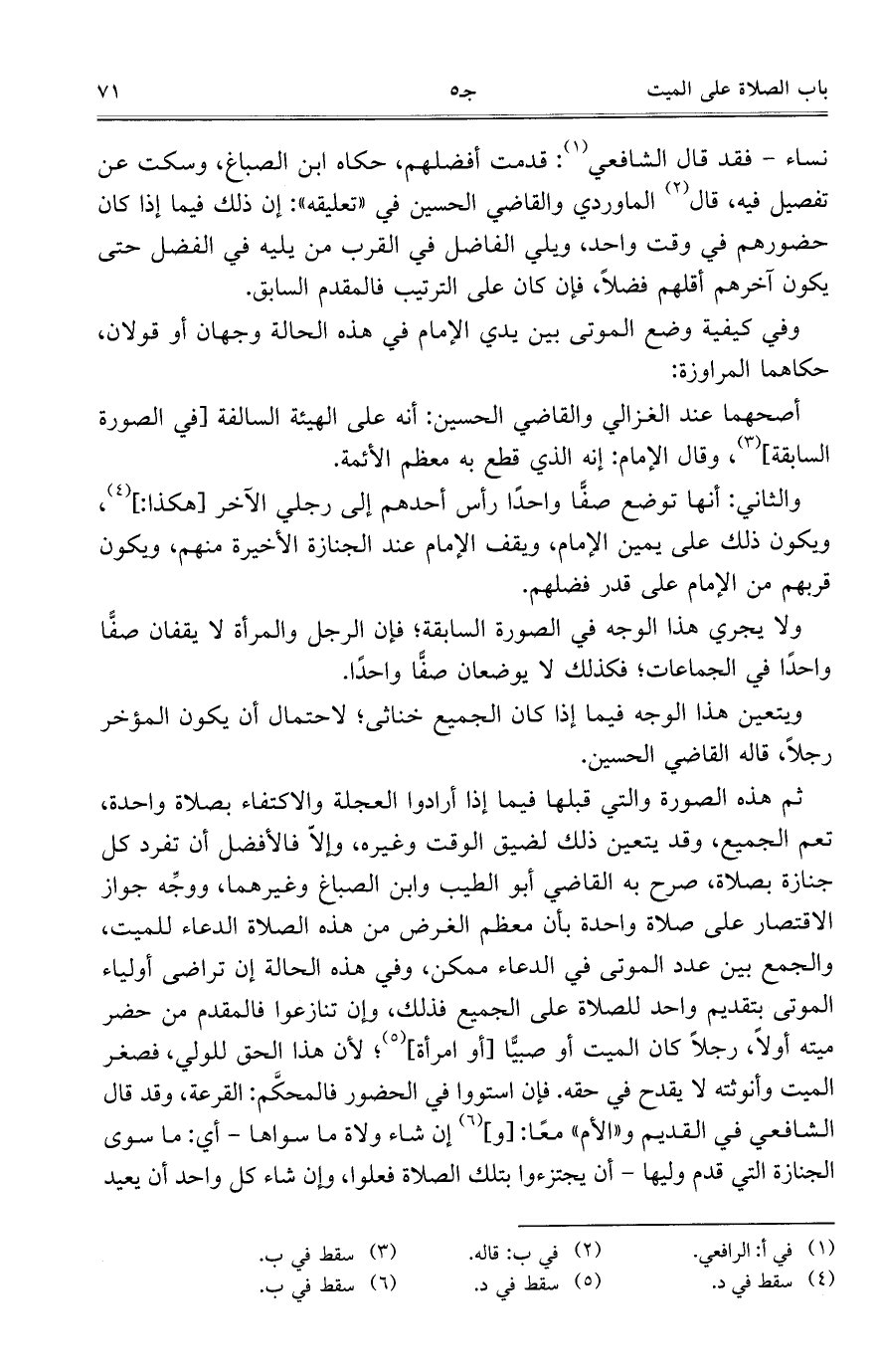 نساء- فقد قال الشافعي: قدمت أفضلهم، حكاه ابن الصباغ، وسكت عن تفصيل فيه، قال الماوردي والقاضي الحسين في "تعليقه": إن ذلك فيما إذا كان حضورهم في وقت واحد، ويلي الفاضل في القرب من يليه في الفضل حتى يكون آخرهم أقلهم فضلاً، فإن كان على الترتيب فالمقدم السابق.