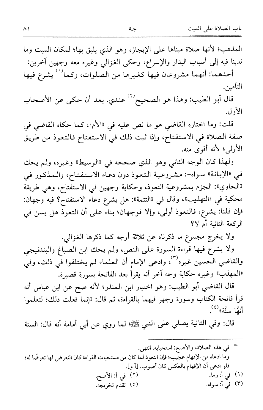 المذهب؛ لأنها صلاة مبناها على الإيجاز، وهو الذي يليق بها؛ لمكان الميت وما ندبنا فيه إلى أسباب البدار والإسراع، وحكى الغزالي وغيره معه وجهين آخرين:
