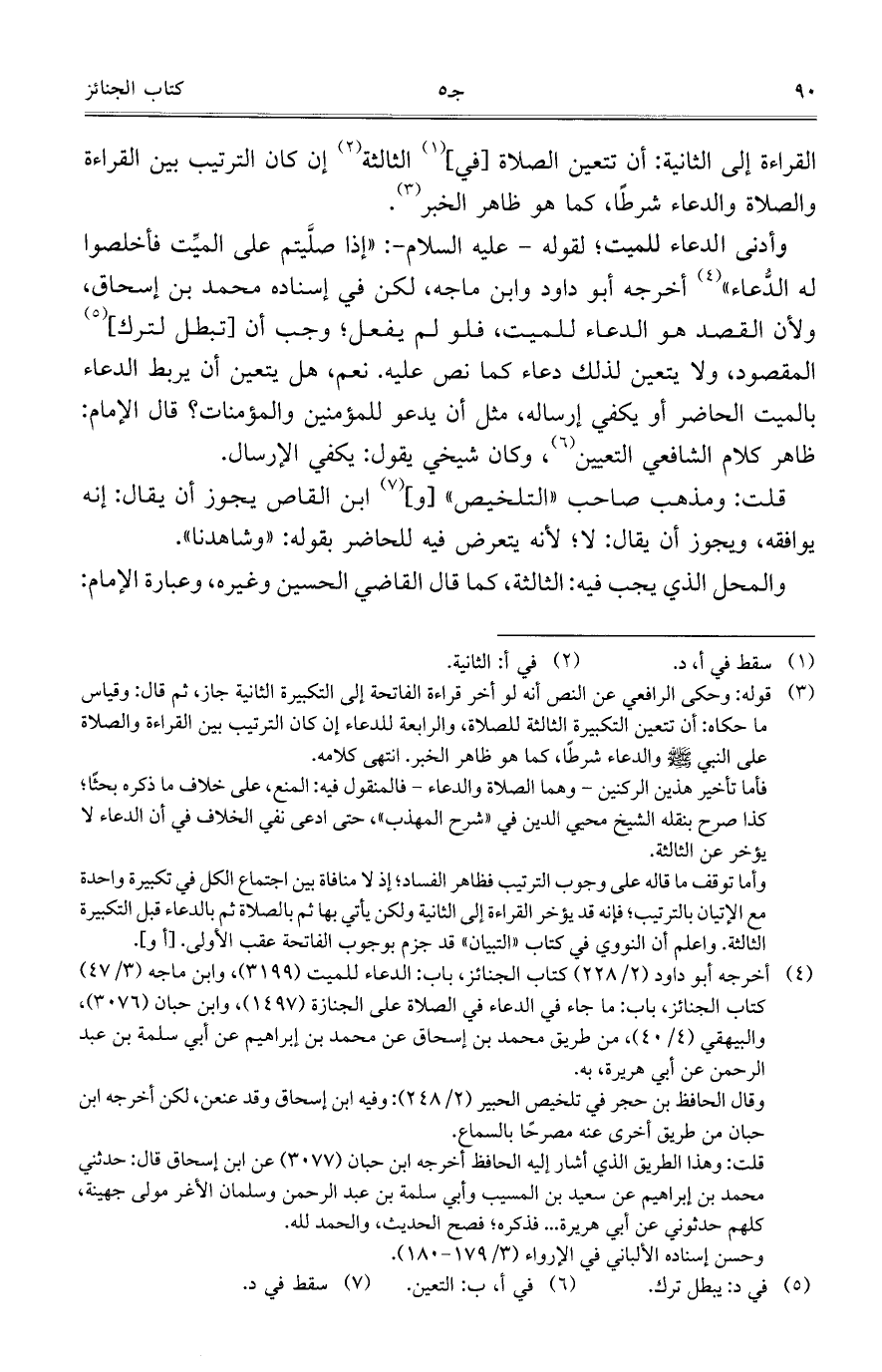وأدنى الدعاء للميت؛ لقوله- عليه السلام-: "إذا صلَّيتم على الميت فأخلصوا له الدعاء" أخرجه أبو داود وابن ماجه، لكن في إسناده محمد بن إسحاق، ولأن القصد هو الدعاء للميت، فلو لم يفعل؛ وجب أن [تبطل لترك] المقصود، ولا يتعين لذلك دعاء كما نص عليه. نعم، هل يتعين أن يربط الدعاء بالميت الحاضر أو يكفي إرساله، مثل أن يدعو للمؤمنين والمؤمنات؟ قال الإمام: ظاهر كلام الشافعي التعيين، وكان شيخي يقول: يكفي الإرسال.