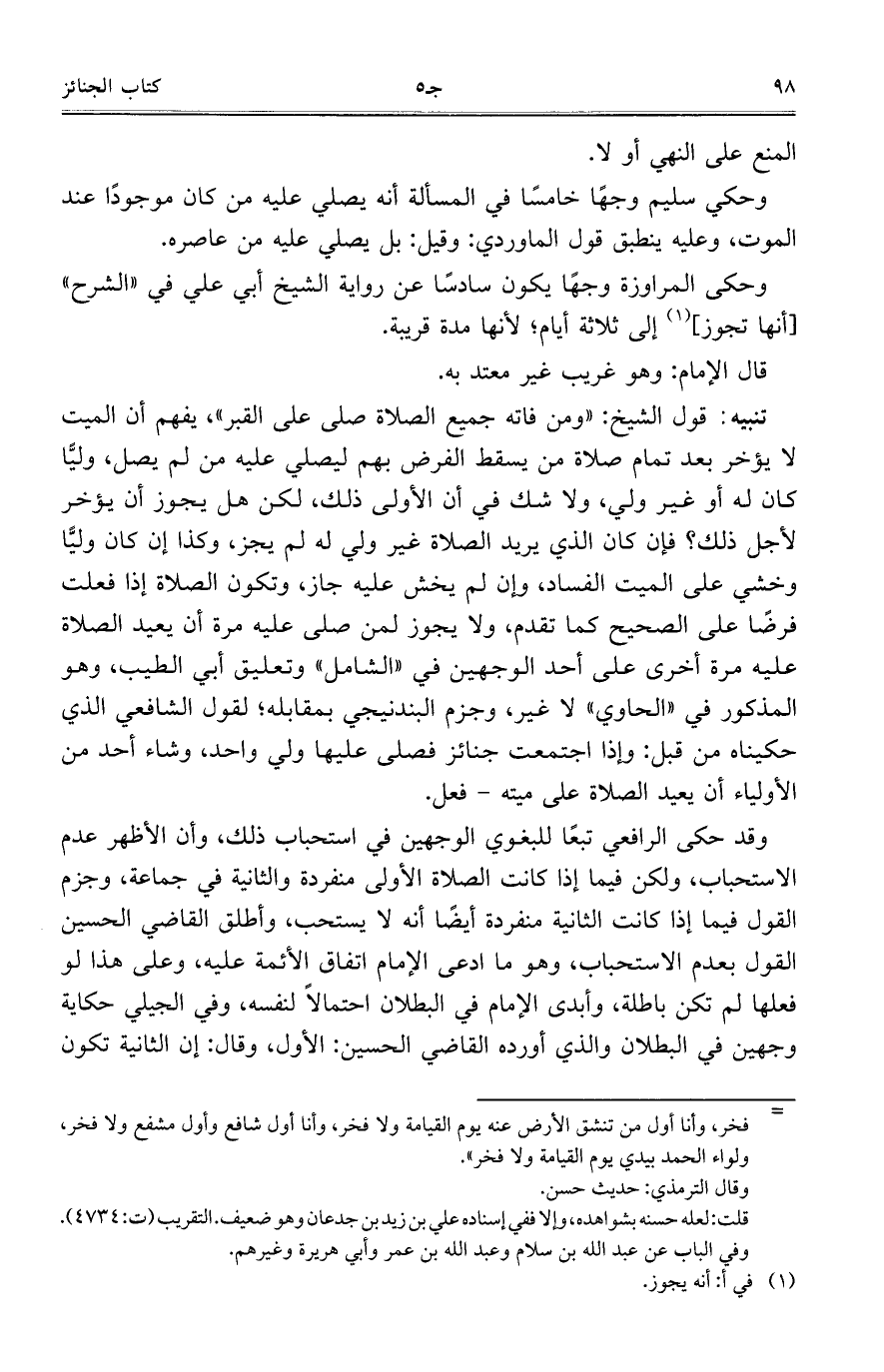 تنبيه: قول الشيخ: "ومن فاته جميع الصلاة صلى على القبر"، يفهم أن الميت لا يؤخر بعد تمام صلاة من يسقط الفرض بهم ليصلي عليه من لم يصل، ولياً كان له أو غير ولي، ولا شك في أن الأولى ذلك، لكن هل يجوز أن يؤخر لأجل ذلك؟ فإن كان الذي يريد الصلاة غير ولي له لم يجز، وكذا إن كان ولياً وخشي على الميت الفساد، وإن لم يخش عليه جاز، وتكون الصلاة إذا فعلت فرضاً على الصحيح كما تقدم، ولا يجوز لمن صلى عليه مرة أن يعيد الصلاة عليه مرة أخرى على أحد الوجهين في "الشامل" وتعليق أبي الطيب، وهو المذكور في "الحاوي" لا غير، وجزم البندنيجي بمقابله؛ لقول الشافعي الذي حكيناه من قبل: وإذا اجتمعت جنائز فصلى عليها ولي واحد، وشاء أحد من الأولياء أن يعيد الصلاة على ميته- فعل.