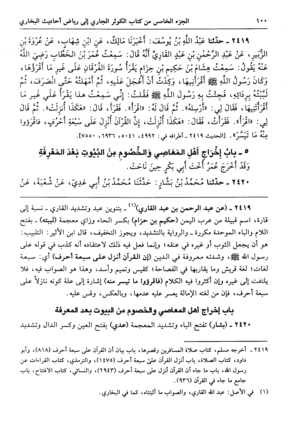 2419 - (عن عبد الرحمن بن عبد القاري) -بتنوين عبد وتشديد القاري- نسبة إلى قارة، اسم قبيلة من عرب اليمن (حكيم بن حزام) بكسر الحاء وزاي معجمة (لببته) -بفتح اللام والباء الموحدة مكررة- والرواية بالتشديد، ويجوز التخفيف، قال ابن الأثير: التلبيب: هو أن يجعل الثوب أو غيره في عنقه؛ وإنما فعل فيه ذلك لاعتقاده أنه كذب في قوله على رسول الله - صلى الله عليه وسلم -، وشدته معروفة في الدين (إن القرآن أنزل على سبعة أحرف) أي: سبعة لغات؛ لغة قريش وما يقاربها في الفصاحة؛ كقيس وتميم وأسد، وهذا هو الصواب فيه، فلا يلتفت إلى غيره وإن أكثروا فيه الكلام (فاقرؤوا ما تيسر منه) إشارة إلى علة كونه نازلًا على سبعة أحرف، فإن من لغته الإمالة يعسر عليه عدمها، وبالعكس، وقس عليه.