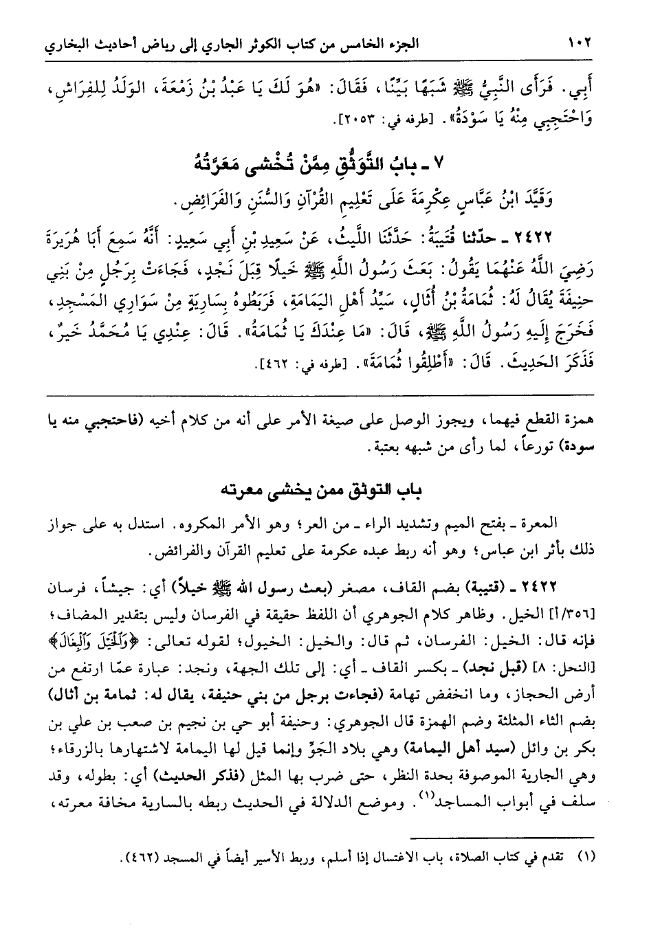 2422 - (قتيبة) بضم القاف، مصغر (بعث رسول الله - صلى الله عليه وسلم - خيلًا) أي: جيشًا، فرسان الخيل. وظاهر كلام الجوهري أن اللفظ حقيقة في الفرسان وليس بتقدير المضاف؛ فإنه قال: الخيل: الفرسان، ثم قال: والخيل: الخيول؛ لقوله تعالى: {وَالْخَيْلَ وَالْبِغَالَ} [النحل: 8] (قبل نجد) -بكسر القاف- أي: إلى تلك الجهة، ونجد: عبارة عمّا ارتفع من أرض الحجاز، وما انخفض تهامة (فجاءت برجل من بني حنيفة، يقال له: ثمامة بن أثال) بضم الثاء المثلثة وضم الهمزة قال الجوهري: وحنيفة أبو حي بن نجيم بن صعب بن علي بن بكر بن وائل (سيد أهل اليمامة) وهي بلاد الجَوِّ وإنما قيل لها اليمامة لاشتهارها بالزرقاء؛ وهي الجارية الموصوفة بحدة النظر، حتى ضرب بها المثل (فذكر الحديث) أي: بطوله، وقد سلف في أبواب المساجد. وموضع الدلالة في الحديث ربطه بالسارية مخافة معرته،