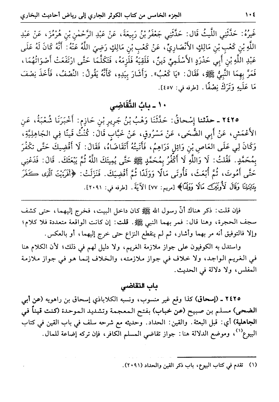2425 - (إسحاق) كذا وقع غير منسوب، ونسبه الكلاباذي إسحاق بن راهويه (عن أبي الضحى) مسلم بن صبيح (عن خباب) بفتح المعجمة وتشديد الموحدة (كنت قينًا في الجاهلية) أي: قبل البعثة. والقين: الحداد. وحديثه مع شرحه سلف في باب القين في كتاب البيوع، وموضع الدلالة هنا: جواز تقاضي المسلم الكافر، فإن تركه إضاعة للمال.