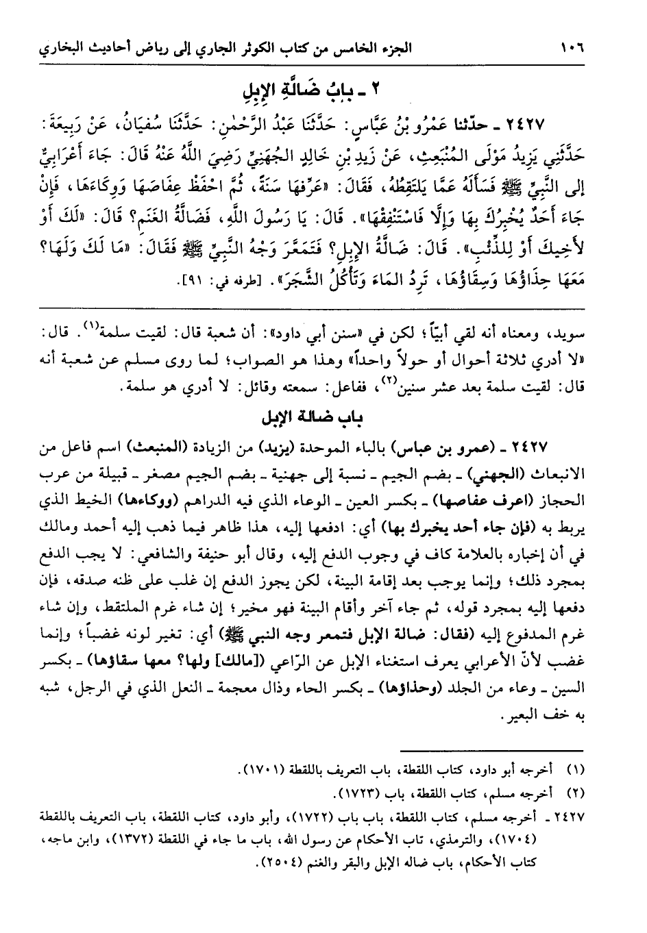2427 - حَدَّثَنَا عَمْرُو بْنُ عَبَّاسٍ حَدَّثَنَا عَبْدُ الرَّحْمَنِ حَدَّثَنَا سُفْيَانُ عَنْ رَبِيعَةَ حَدَّثَنِى يَزِيدُ مَوْلَى الْمُنْبَعِثِ عَنْ زَيْدِ بْنِ خَالِدٍ الْجُهَنِىِّ - رضى الله عنه - قَالَ جَاءَ أَعْرَابِىٌّ النَّبِىَّ - صلى الله عليه وسلم - فَسَأَلَهُ عَمَّا يَلْتَقِطُهُ فَقَالَ «عَرِّفْهَا سَنَةً، ثُمَّ احْفَظْ عِفَاصَهَا وَوِكَاءَهَا، فَإِنْ جَاءَ أَحَدٌ يُخْبِرُكَ بِهَا، وَإِلاَّ فَاسْتَنْفِقْهَا». قَالَ يَا رَسُولَ اللَّهِ فَضَالَّةُ الْغَنَمِ قَالَ «لَكَ أَوْ لأَخِيكَ أَوْ لِلذِّئْبِ». قَالَ ضَالَّةُ الإِبِلِ فَتَمَعَّرَ وَجْهُ النَّبِيِّ - صلى الله عليه وسلم -. فَقَالَ «مَا لَكَ وَلَهَا، مَعَهَا حِذَاؤُهَا وَسِقَاؤُهَا، تَرِدُ الْمَاءَ وَتَأْكُلُ الشَّجَرَ». طرفه 91