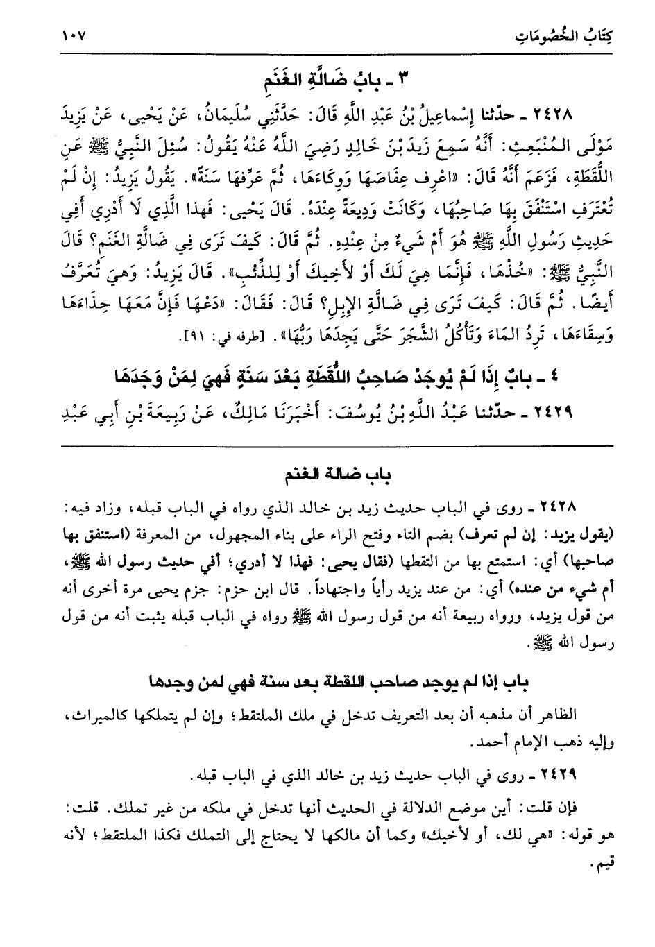 2428 - روى في الباب حديث زيد بن خالد الذي رواه في الباب قبله، وزاد فيه: (يقول يزيد: إن لم تعرف) بضم التاء وفتح الراء على بناء المجهول، من المعرفة (استنفق بها صاحبها) أي: استمتع بها من التقطها (فقال يحيى: فهذا لا أدري؛ أفي حديث رسول الله - صلى الله عليه وسلم -، أم شيء من عنده) أي: من عند يزيد رأيًا واجتهادًا. قال ابن حزم: جزم يحيى مرة أخرى أنه من قول يزيد، ورواه ربيعة أنه من قول رسول الله - صلى الله عليه وسلم - رواه في الباب قبله يثبت أنه من قول رسول الله - صلى الله عليه وسلم -.