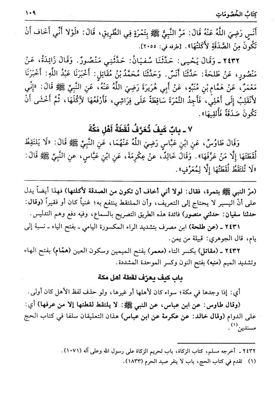 (مرّ النبي - صلى الله عليه وسلم - بتمرة، فقال: لولا أني أخاف أن تكون من الصدقة لأكلتها) فهذا أيضًا يدل على أنّ اليسير لا يحتاج إلى التعريف، وأن الملتقط ينتفع به؛ غنيًّا كان أو فقيرًا (وقال: حدثنا سفيان: حدثني منصور) فائدة هذه الطريق التصريح بالسماع، وفيه دفع وهم التدليس.