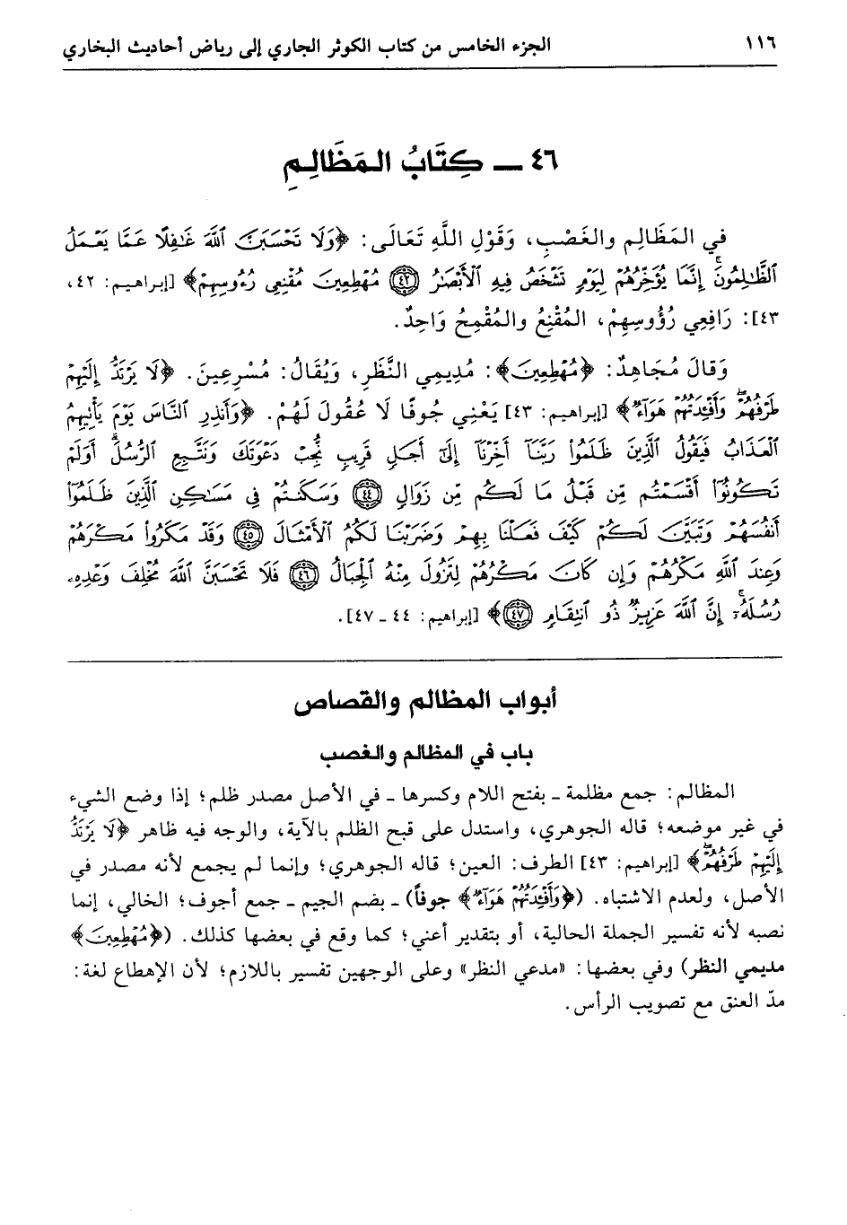 في المَظَالِمِ وَالغَصْبِ، وَقَوْلِ اللَّهِ تَعَالَى: {وَلاَ تَحْسَبَنَّ اللَّهَ غَافِلًا عَمَّا يَعْمَلُ الظَّالِمُونَ، إِنَّمَا يُؤَخِّرُهُمْ لِيَوْمٍ تَشْخَصُ فِيهِ الأَبْصَارُ مُهْطِعِينَ مُقْنِعِي رُءُوسِهِمْ} [إبراهيم: 43] «رَافِعِي، المُقْنِعُ وَالمُقْمِحُ وَاحِدٌ».