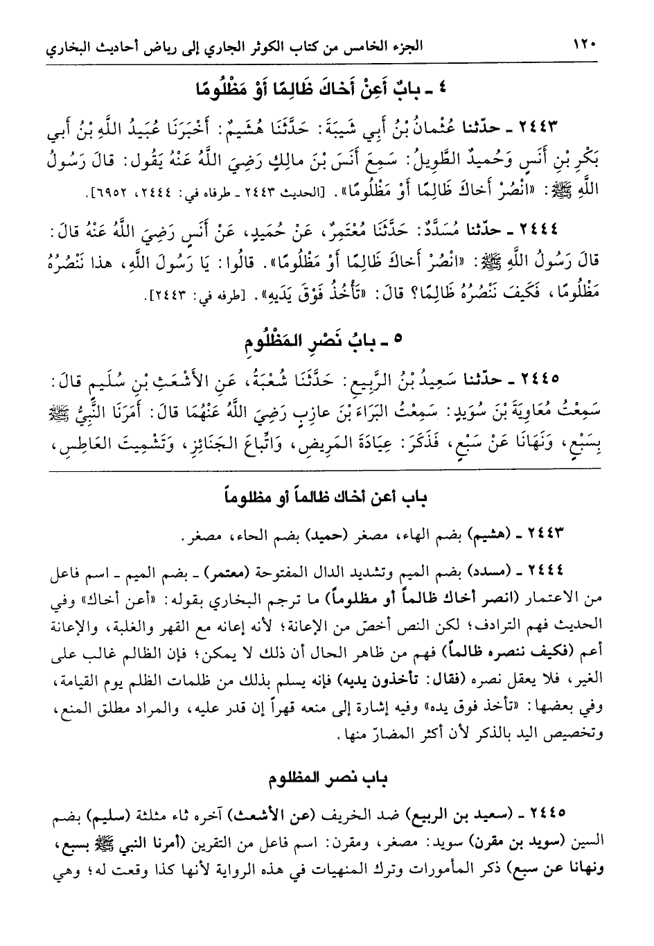 2444 - (مسدد) بضم الميم وتشديد الدال المفتوحة (معتمر) -بضم الميم- اسم فاعل من الاعتمار (انصر أخاك ظالمًا أو مظلومًا) ما ترجم البخاري بقوله: "أعن أخاك" وفي الحديث فهم الترادف؛ لكن النص أخصّ من الإعانة؛ لأنه إعانه مع القهر والغلبة، والإعانة أعم (فكيف ننصره ظالمًا) فهم من ظاهر الحال أن ذلك لا يمكن؛ فإن الظالم غالب على الغير، فلا يعقل نصره (فقال: تأخذون يديه) فإنه يسلم بذلك من ظلمات الظلم يوم القيامة، وفي بعضها: "تأخذ فوق يده" وفيه إشارة إلى منعه قهرًا إن قدر عليه، والمراد مطلق المنع، وتخصيص اليد بالذكر لأن أكثر المضارّ منها.