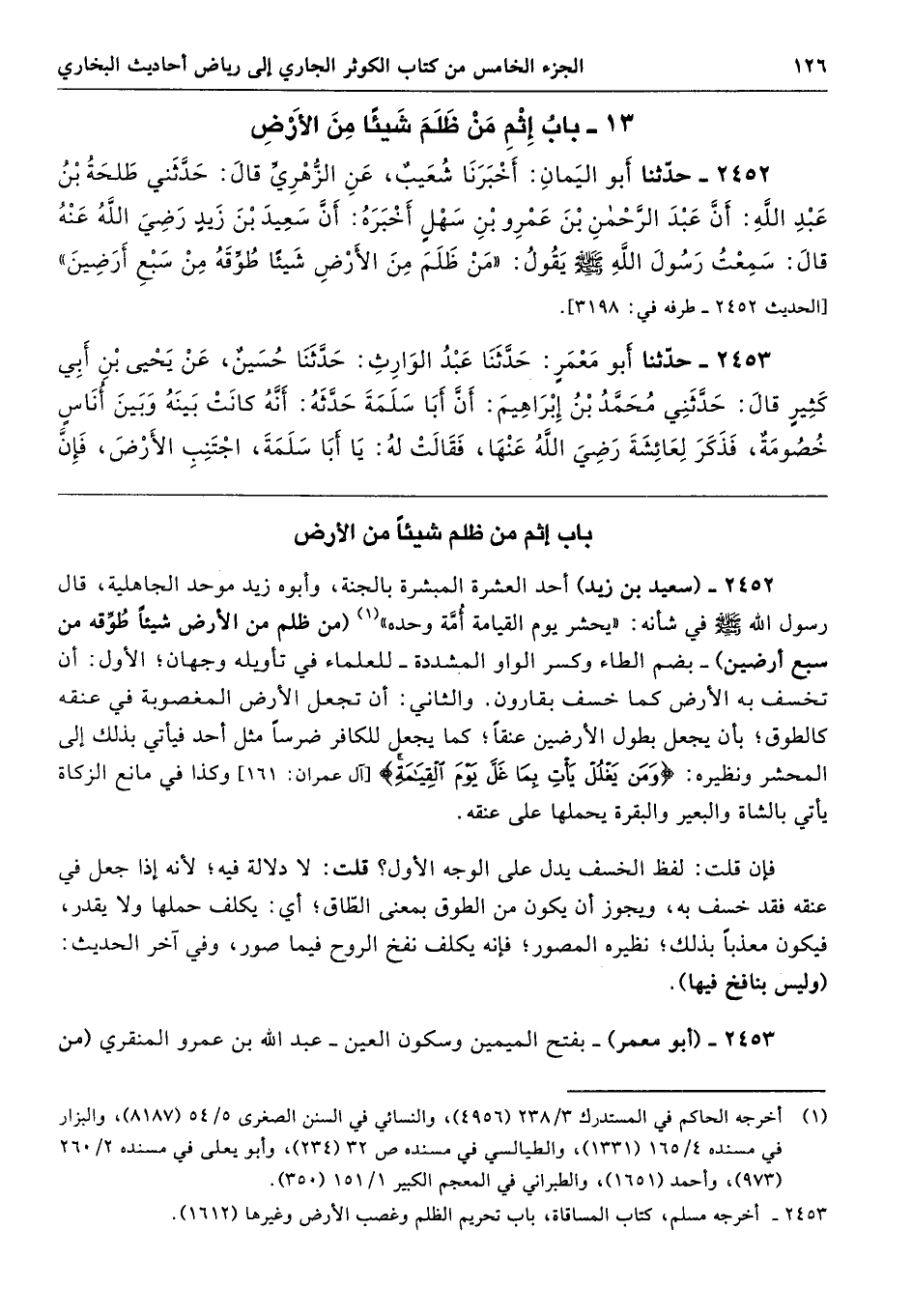 2452 - (سعيد بن زيد) أحد العشرة المبشرة بالجنة، وأبوه زيد موحد الجاهلية، قال رسول الله - صلى الله عليه وسلم - في شأنه: "يحشر يوم القيامة أُمَّة وحده" (من ظلم من الأرض شيئًا طُوِّقه من سبع أرضين) -بضم الطاء وكسر الواو المشددة- للعلماء في تأويله وجهان؛ الأول: أن تخسف به الأرض كما خسف بقارون. والثاني: أن تجعل الأرض المغصوبة في عنقه كالطوق؛ بأن يجعل بطول الأرضين عنقًا؛ كما يجعل للكافر ضرسًا مثل أحد فيأتي بذلك إلى المحشر ونظيره: {وَمَنْ يَغْلُلْ يَأْتِ بِمَا غَلَّ يَوْمَ الْقِيَامَةِ} [آل عمران: 161] وكذا في مانع الزكاة يأتي بالشاة والبعير والبقرة يحملها على عنقه.