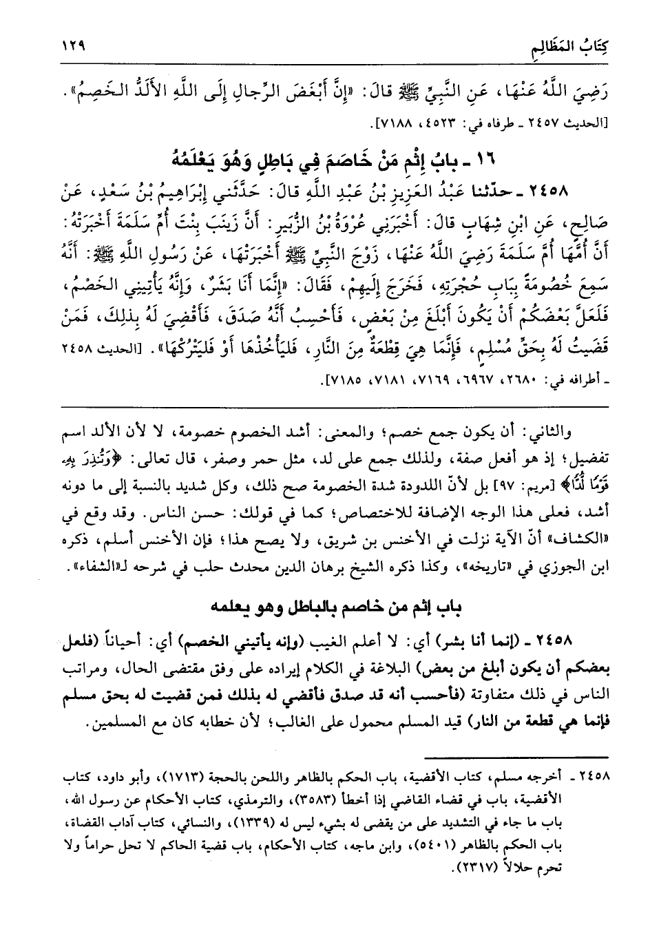 - رضى الله عنها - عَنِ النَّبِيِّ - صلى الله عليه وسلم - قَالَ «إِنَّ أَبْغَضَ الرِّجَالِ إِلَى اللَّهِ الأَلَدُّ الْخَصِمُ». طرفاه 4523، 7188