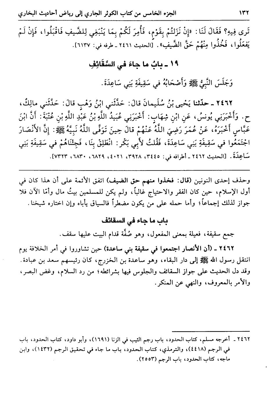 2462 - (أن الأنصار اجتمعوا في سقيفة بني ساعدة) حين تشاوروا في أمر الخلافة يوم انتقل رسول الله - صلى الله عليه وسلم - إلى دار البقاء، وهو ساعدة بن الخزرج، كان رئيسهم سعد بن عبادة. وقد دل الحديث على جواز السقائف والجلوس فيها بشرائطه؛ من رد السلام، وغض البصر، والأمر بالمعروف، والنهي عن المنكر.