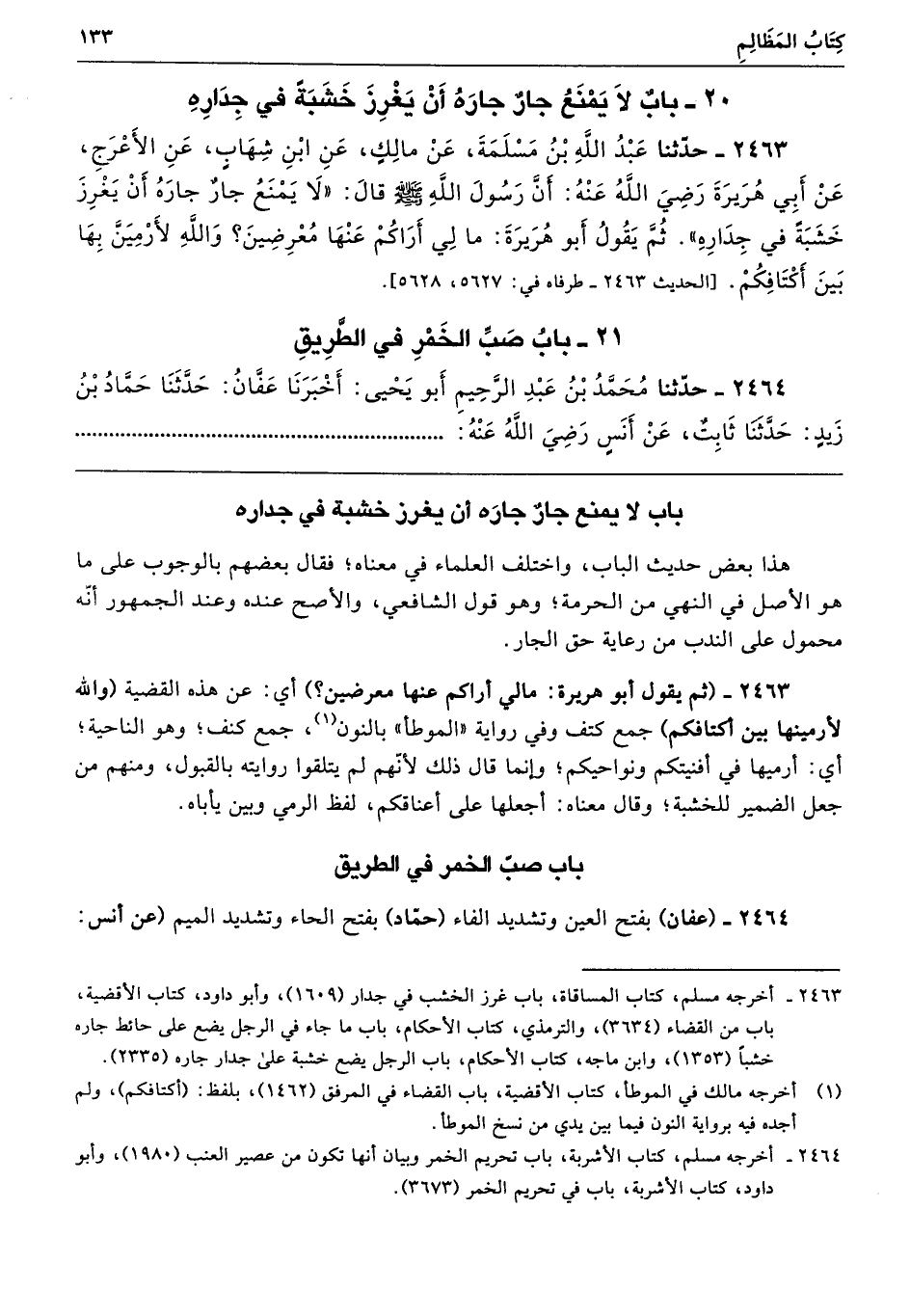 2463 - حَدَّثَنَا عَبْدُ اللَّهِ بْنُ مَسْلَمَةَ عَنْ مَالِكٍ عَنِ ابْنِ شِهَابٍ عَنِ الأَعْرَجِ عَنْ أَبِى هُرَيْرَةَ رضى الله عنه أَنَّ رَسُولَ اللَّهِ - صلى الله عليه وسلم - قَالَ «لاَ يَمْنَعُ جَارٌ جَارَهُ أَنْ يَغْرِزَ خَشَبَهُ فِي جِدَارِهِ». ثُمَّ يَقُولُ أَبُو هُرَيْرَةَ مَا لِى أَرَاكُمْ عَنْهَا مُعْرِضِينَ وَاللَّهِ لأَرْمِيَنَّ بِهَا بَيْنَ أَكْتَافِكُمْ. طرفاه 5627، 5628