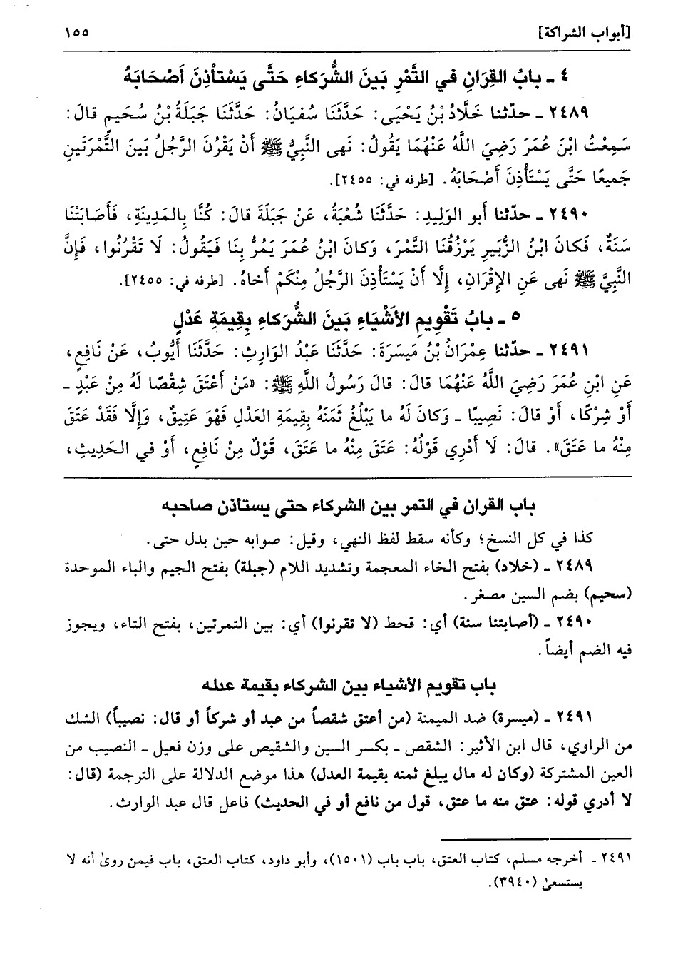 4 - باب الْقِرَانِ فِي التَّمْرِ بَيْنَ الشُّرَكَاءِ حَتَّى يَسْتَأْذِنَ أَصْحَابَهُ
