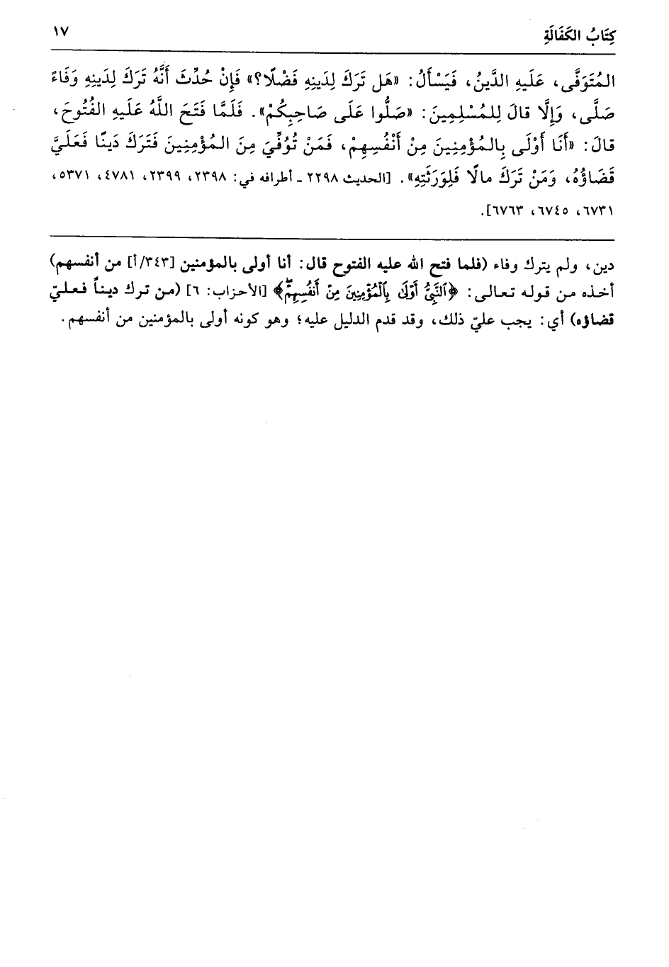 الْمُتَوَفَّى عَلَيْهِ الدَّيْنُ فَيَسْأَلُ «هَلْ تَرَكَ لِدَيْنِهِ فَضْلاً». فَإِنْ حُدِّثَ أَنَّهُ تَرَكَ لِدَيْنِهِ وَفَاءً صَلَّى، وَإِلاَّ قَالَ لِلْمُسْلِمِينَ «صَلُّوا عَلَى صَاحِبِكُمْ». فَلَمَّا فَتَحَ اللَّهُ عَلَيْهِ الْفُتُوحَ قَالَ «أَنَا أَوْلَى بِالْمُؤْمِنِينَ مِنْ أَنْفُسِهِمْ، فَمَنْ تُوُفِّىَ مِنَ الْمُؤْمِنِينَ فَتَرَكَ دَيْنًا فَعَلَىَّ قَضَاؤُهُ، وَمَنْ تَرَكَ مَالاً فَلِوَرَثَتِهِ». أطرافه 2398، 2399، 4781، 5371، 6731، 6745، 6763