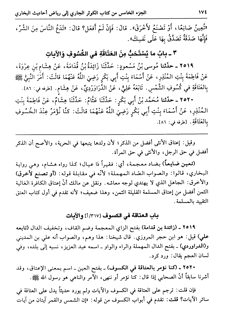 2520 - (كنا نؤمر بالعتاقة في الكسوف) -بفتح العين- اسم بمعنى الإعتاق، وقد أشرنا سابقًا أن الصحابي إذا قال: كنا نؤمر أو ننهى، الآمر والناهي هو رسول الله - صلى الله عليه وسلم -.