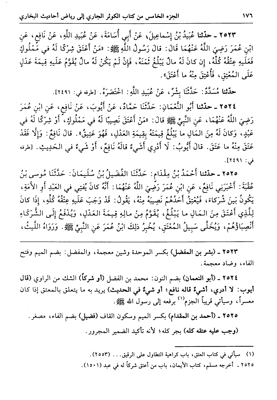 2525 - حَدَّثَنَا أَحْمَدُ بْنُ مِقْدَامٍ حَدَّثَنَا الْفُضَيْلُ بْنُ سُلَيْمَانَ حَدَّثَنَا مُوسَى بْنُ عُقْبَةَ أَخْبَرَنِى نَافِعٌ عَنِ ابْنِ عُمَرَ - رضى الله عنهما - أَنَّهُ كَانَ يُفْتِى فِي الْعَبْدِ أَوِ الأَمَةِ يَكُونُ بَيْنَ شُرَكَاءَ، فَيُعْتِقُ أَحَدُهُمْ نَصِيبَهُ مِنْهُ، يَقُولُ قَدْ وَجَبَ عَلَيْهِ عِتْقُهُ كُلِّهِ، إِذَا كَانَ لِلَّذِى أَعْتَقَ مِنَ الْمَالِ مَا يَبْلُغُ، يُقَوَّمُ مِنْ مَالِهِ قِيمَةَ الْعَدْلِ، وَيُدْفَعُ إِلَى الشُّرَكَاءِ أَنْصِبَاؤُهُمْ، وَيُخَلَّى سَبِيلُ الْمُعْتَقِ. يُخْبِرُ ذَلِكَ ابْنُ عُمَرَ عَنِ النَّبِيِّ - صلى الله عليه وسلم -. وَرَوَاهُ اللَّيْثُ