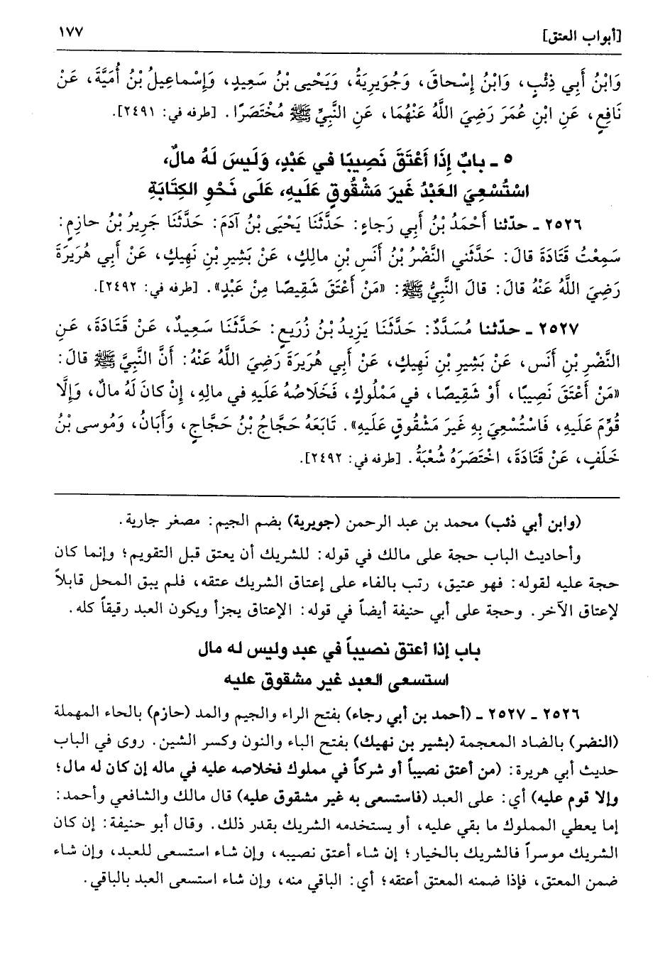 2526 - 2527 - (أحمد بن أبي رجاء) بفتح الراء والجيم والمد (حازم) بالحاء المهملة (النضر) بالضاد المعجمة (بشير بن نهيك) بفتح الباء والنون وكسر الشين. روى في الباب حديث أبي هريرة: (من أعتق نصيبًا أو شركًا في مملوك فخلاصه عليه في ماله إن كان له مال؛ وإلا قوم عليه) أي: على العبد (فاستسعى به غير مشقوق عليه) قال مالك والشافعي وأحمد: إما يعطي المملوك ما بقي عليه، أو يستخدمه الشريك بقدر ذلك. وقال أبو حنيفة: إن كان الشريك موسرًا فالشريك بالخيار؛ إن شاء أعتق نصيبه، وإن شاء استسعى للعبد، وإن شاء ضمن المعتق، فإذا ضمنه المعتق أعتقه؛ أي: الباقي منه، وإن شاء استسعى العبد بالباقي.