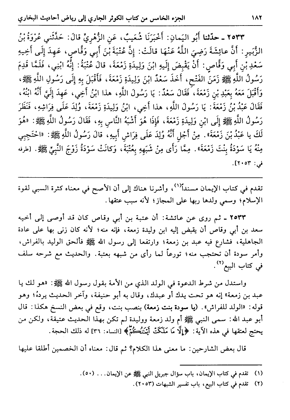 2533 - ثم روى عن عائشة: أن عتبة بن أبي وقاص كان قد أوصى إلى أخيه سعد بن أبي وقاص أن يقبض إليه ابن وليدة زمعة، فإنه منه؛ لأنه كان زنى بها على عادة الجاهلية، فشارع فيه عبد بن زمعة؛ وارتفعا إلى رسول الله - صلى الله عليه وسلم - فألحق الوليد بالفراش، وأمر سودة أن تحتجب منه؛ تورعًا لما رأى من شبهه بعتبة. والحديث مع شرحه سلف في كتاب البيع.
