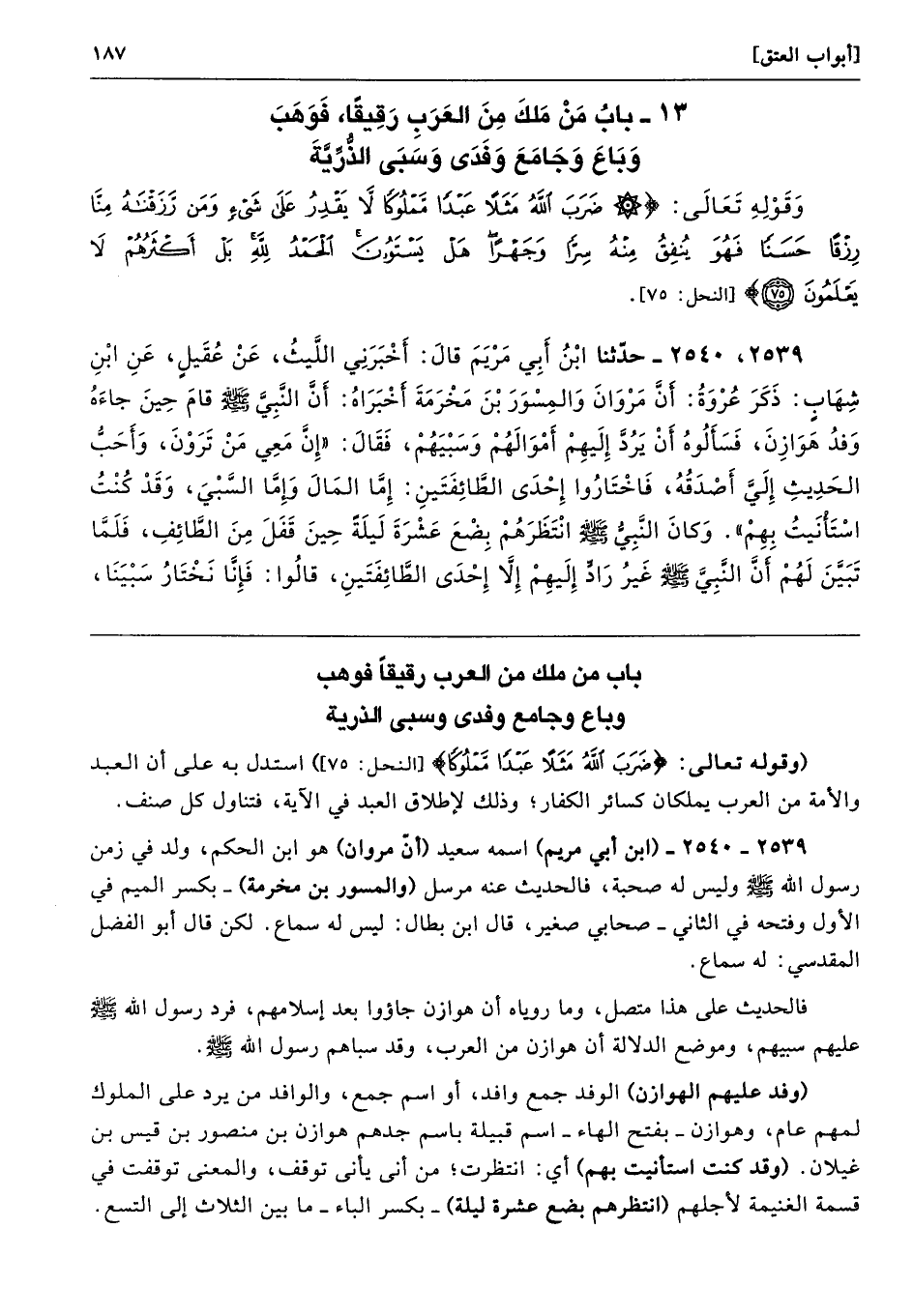 13 - باب مَنْ مَلَكَ مِنَ الْعَرَبِ رَقِيقًا فَوَهَبَ وَبَاعَ وَجَامَعَ وَفَدَى وَسَبَى الذُّرِّيَّةَ