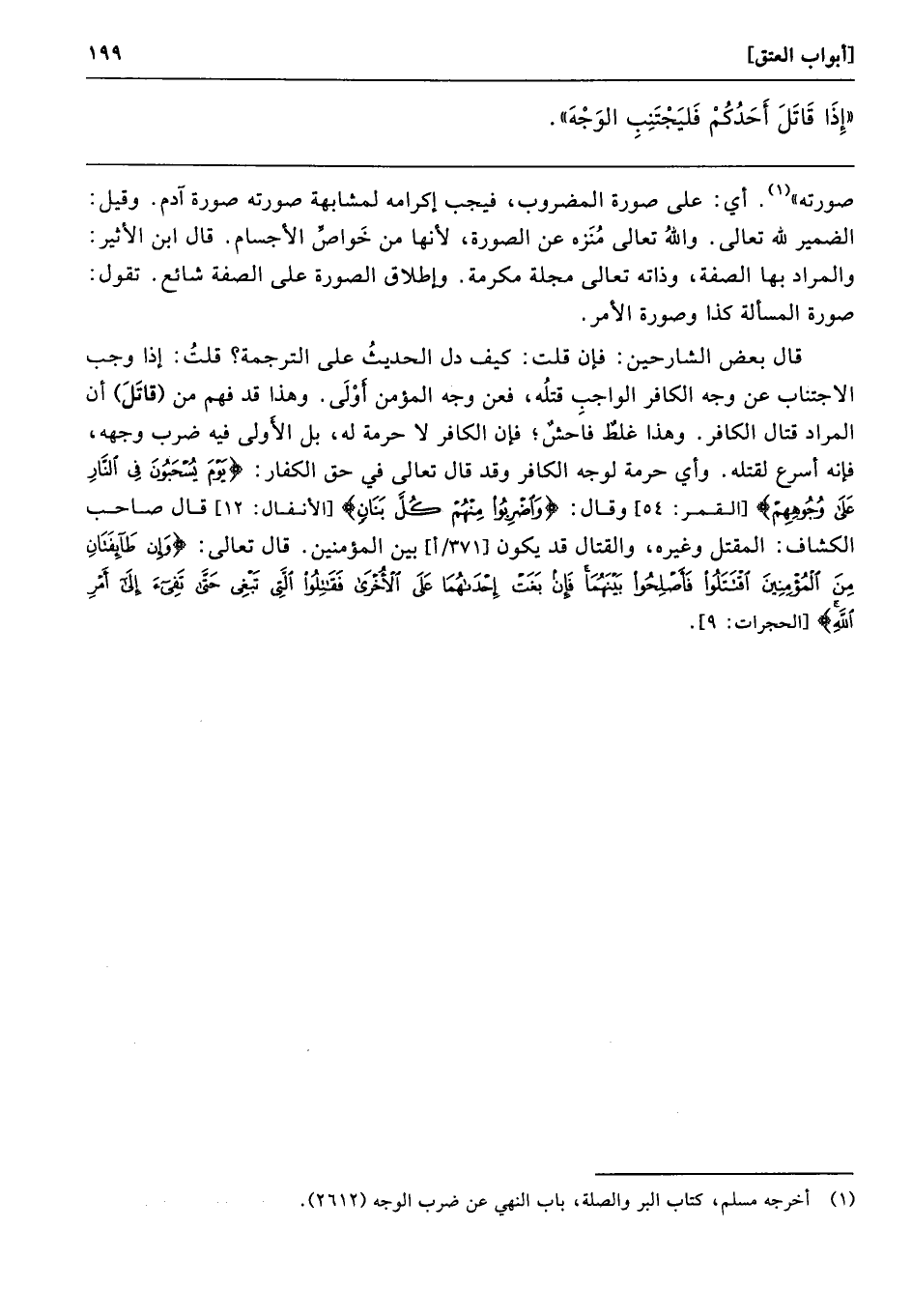 قال بعض الشارحين: فإن قلت: كيف دل الحديثُ على الترجمة؟ قلتُ: إذا وجب الاجتناب عن وجه الكافر الواجبِ قتلُه، فعن وجه المؤمن أَوْلَى. وهذا قد فهم من (قاتَلَ) أن المراد قتال الكافر. وهذا غلطٌ فاحشٌ؛ فإن الكافر لا حرمة له، بل الأولى فيه ضرب وجهه، فإنه أسرع لقتله. وأي حرمة لوجه الكافر وقد قال تعالى في حق الكفار: {يَوْمَ يُسْحَبُونَ فِي النَّارِ عَلَى وُجُوهِهِمْ} [القمر: 48] وقال: {وَاضْرِبُوا مِنْهُمْ كُلَّ بَنَانٍ} [الأنفال: 12] قال صاحب الكشاف: المقتل وغيره، والقتال قد يكون بين المؤمنين. قال تعالى: {وَإِنْ طَائِفَتَانِ مِنَ الْمُؤْمِنِينَ اقْتَتَلُوا فَأَصْلِحُوا بَيْنَهُمَا فَإِنْ بَغَتْ إِحْدَاهُمَا عَلَى الْأُخْرَى فَقَاتِلُوا الَّتِي تَبْغِي حَتَّى تَفِيءَ إِلَى أَمْرِ اللَّهِ} [الحجرات: 9].