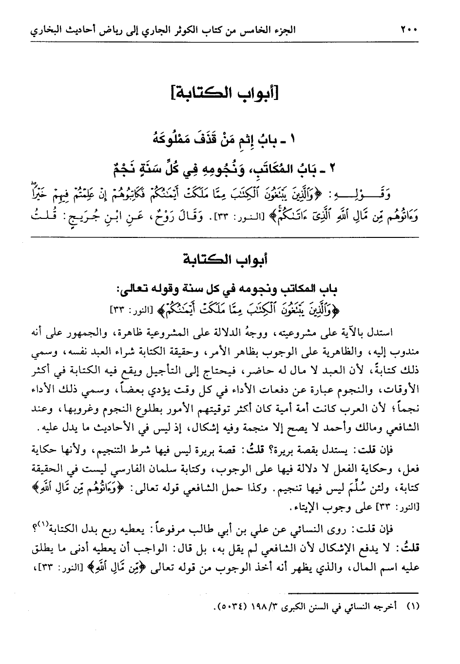 فإن قلت: يستدل بقصة بريرة؟ قلتُ: قصة بريرة ليس فيها شرط التنجيم، ولأنها حكاية فعل، وحكاية الفعل لا دلالة فيها على الوجوب، وكتابة سلمان الفارسي ليست في الحقيقة كتابة، ولئن سُلِّمَ ليس فيها تنجيم. وكذا حمل الشافعي قوله تعالى: {وَآتُوهُمْ مِنْ مَالِ اللَّهِ} [النور: 33] على وجوب الإيتاء.