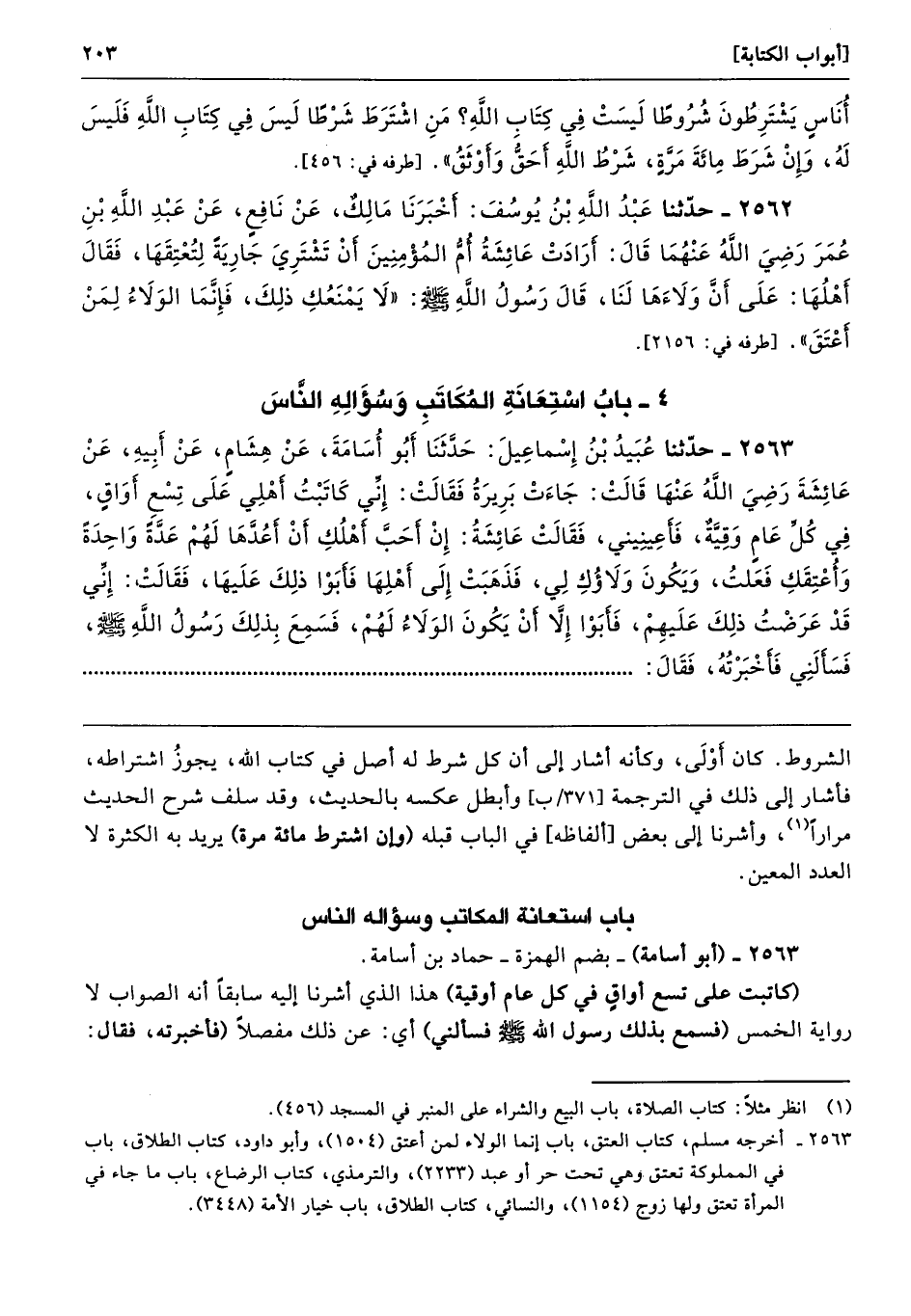 2563 - حَدَّثَنَا عُبَيْدُ بْنُ إِسْمَاعِيلَ حَدَّثَنَا أَبُو أُسَامَةَ عَنْ هِشَامٍ عَنْ أَبِيهِ عَنْ عَائِشَةَ - رضى الله عنها - قَالَتْ جَاءَتْ بَرِيرَةُ فَقَالَتْ إِنِّى كَاتَبْتُ أَهْلِى عَلَى تِسْعِ أَوَاقٍ، فِي كُلِّ عَامٍ وَقِيَّةٌ، فَأَعِينِينِى. فَقَالَتْ عَائِشَةُ إِنْ أَحَبَّ أَهْلُكِ أَنْ أَعُدَّهَا لَهُمْ عَدَّةً وَاحِدَةً، وَأُعْتِقَكِ فَعَلْتُ، وَيَكُونَ وَلاَؤُكِ لِى. فَذَهَبَتْ إِلَى أَهْلِهَا، فَأَبَوْا ذَلِكَ عَلَيْهَا، فَقَالَتْ إِنِّى قَدْ عَرَضْتُ ذَلِكَ عَلَيْهِمْ، فَأَبَوْا إِلاَّ أَنْ يَكُونَ الْوَلاَءُ لَهُمْ. فَسَمِعَ بِذَلِكَ رَسُولُ اللَّهِ - صلى الله عليه وسلم - فَسَأَلَنِى فَأَخْبَرْتُهُ، فَقَالَ: