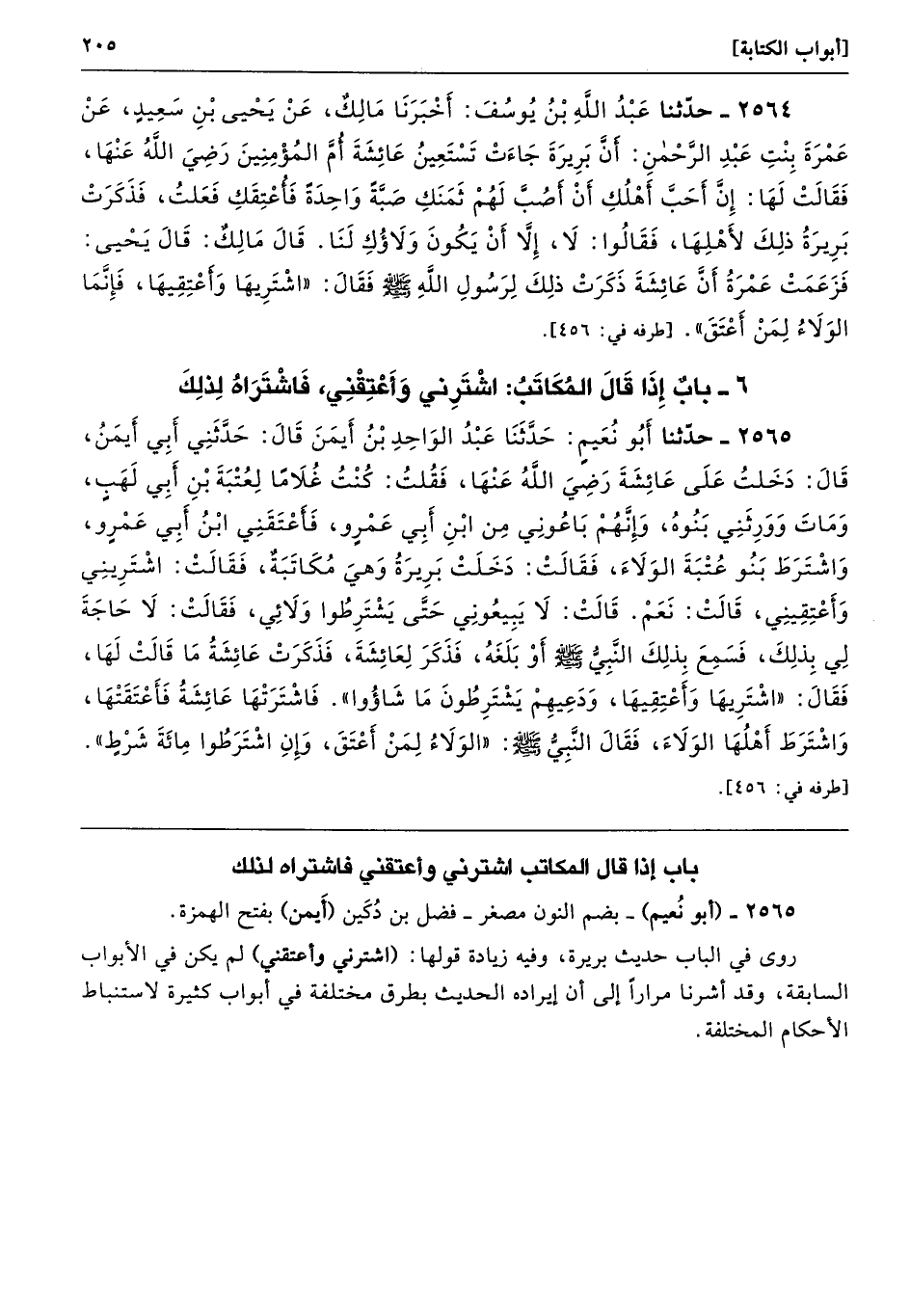 2565 - حَدَّثَنَا أَبُو نُعَيْمٍ حَدَّثَنَا عَبْدُ الْوَاحِدِ بْنُ أَيْمَنَ قَالَ حَدَّثَنِى أَبِى أَيْمَنُ قَالَ دَخَلْتُ عَلَى عَائِشَةَ - رضى الله عنها - فَقُلْتُ كُنْتُ غُلاَمًا لِعُتْبَةَ بْنِ أَبِى لَهَبٍ، وَمَاتَ وَوَرِثَنِى بَنُوهُ، وَإِنَّهُمْ بَاعُونِى مِنَ ابْنِ أَبِى عَمْرٍو، فَأَعْتَقَنِى ابْنُ أَبِى عَمْرٍو، وَاشْتَرَطَ بَنُو عُتْبَةَ الْوَلاَءَ. فَقَالَتْ دَخَلَتْ بَرِيرَةُ وَهْىَ مُكَاتَبَةٌ فَقَالَتِ اشْتَرِينِى وَأَعْتِقِينِى. قَالَتْ نَعَمْ. قَالَتْ لاَ يَبِيعُونِى حَتَّى يَشْتَرِطُوا وَلاَئِى. فَقَالَتْ لاَ حَاجَةَ لِى بِذَلِكَ. فَسَمِعَ بِذَلِكَ النَّبِىُّ - صلى الله عليه وسلم - أَوْ بَلَغَهُ، فَذَكَرَ لِعَائِشَةَ، فَذَكَرَتْ عَائِشَةُ مَا قَالَتْ لَهَا، فَقَالَ «اشْتَرِيهَا وَأَعْتِقِيهَا، وَدَعِيهِمْ يَشْتَرِطُونَ مَا شَاءُوا». فَاشْتَرَتْهَا عَائِشَةُ فَأَعْتَقَتْهَا وَاشْتَرَطَ أَهْلُهَا الْوَلاَءَ، فَقَالَ النَّبِىُّ - صلى الله عليه وسلم - «الْوَلاَءُ لِمَنْ أَعْتَقَ، وَإِنِ اشْتَرَطُوا مِائَةَ شَرْطٍ». طرفه 456