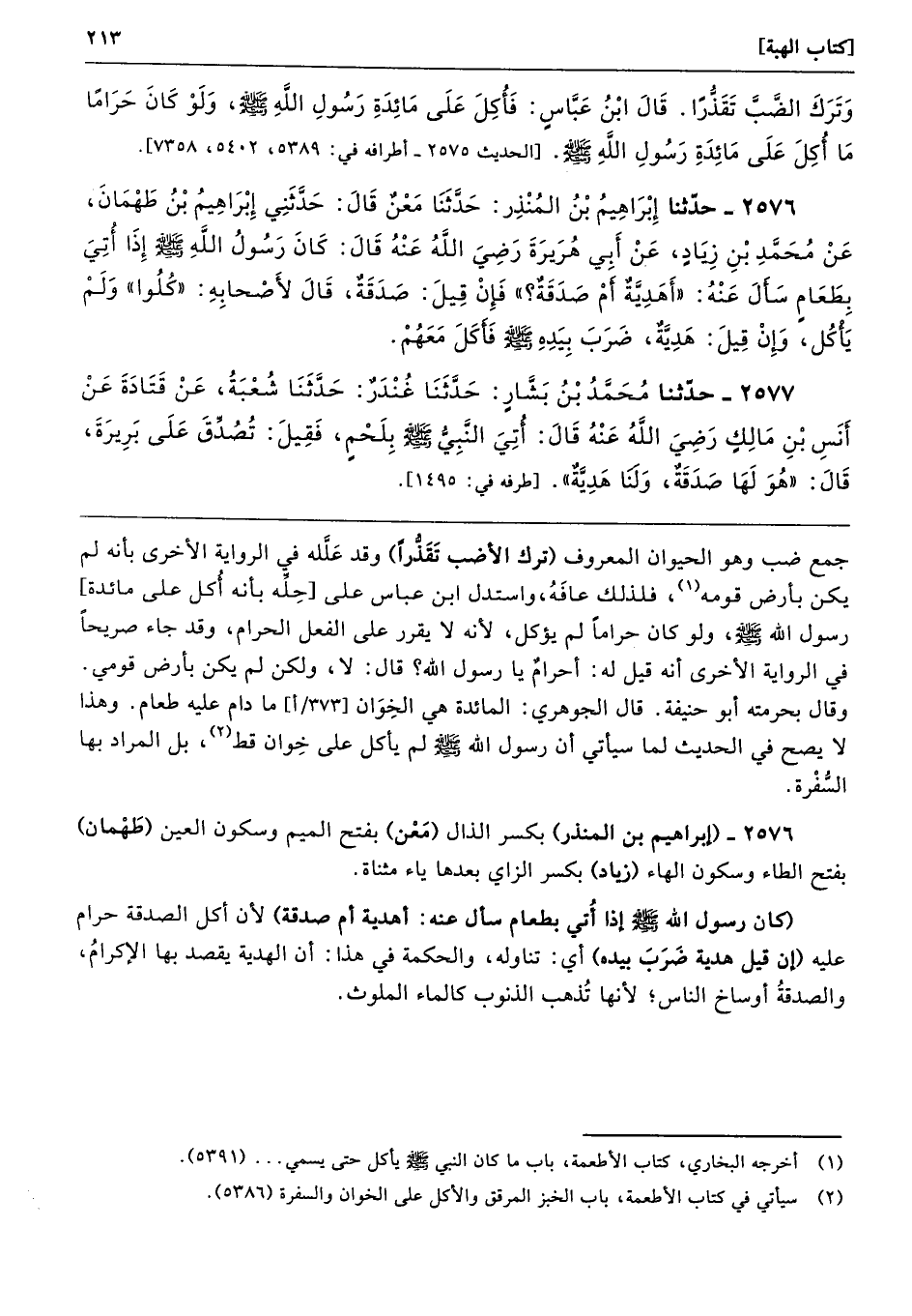 2576 - حَدَّثَنَا إِبْرَاهِيمُ بْنُ الْمُنْذِرِ حَدَّثَنَا مَعْنٌ قَالَ حَدَّثَنِى إِبْرَاهِيمُ بْنُ طَهْمَانَ عَنْ مُحَمَّدِ بْنِ زِيَادٍ عَنْ أَبِى هُرَيْرَةَ - رضى الله عنه - قَالَ كَانَ رَسُولُ اللَّهِ - صلى الله عليه وسلم - إِذَا أُتِىَ بِطَعَامٍ سَأَلَ عَنْهُ أَهَدِيَّةٌ أَمْ صَدَقَةٌ فَإِنْ قِيلَ صَدَقَةٌ. قَالَ لأَصْحَابِهِ كُلُوا. وَلَمْ يَأْكُلْ، وَإِنْ قِيلَ هَدِيَّةٌ. ضَرَبَ بِيَدِهِ - صلى الله عليه وسلم - فَأَكَلَ مَعَهُمْ».