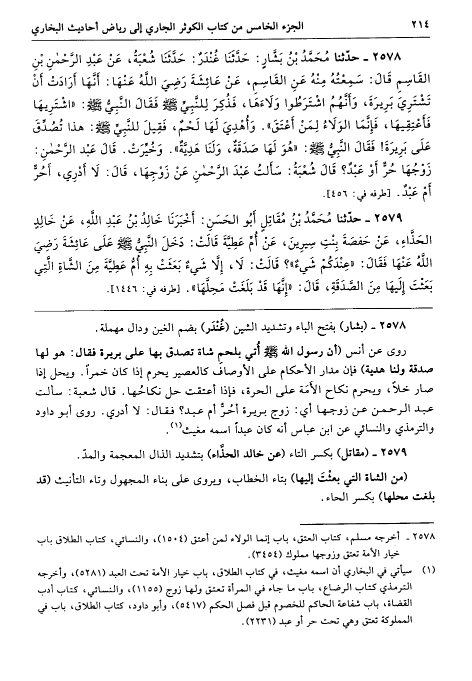 2578 - حَدَّثَنَا مُحَمَّدُ بْنُ بَشَّارٍ حَدَّثَنَا غُنْدَرٌ حَدَّثَنَا شُعْبَةُ عَنْ عَبْدِ الرَّحْمَنِ بْنِ الْقَاسِمِ قَالَ سَمِعْتُهُ مِنْهُ عَنِ الْقَاسِمِ عَنْ عَائِشَةَ - رضى الله عنها - أَنَّهَا أَرَادَتْ أَنْ تَشْتَرِىَ بَرِيرَةَ، وَأَنَّهُمُ اشْتَرَطُوا وَلاَءَهَا، فَذُكِرَ لِلنَّبِىِّ - صلى الله عليه وسلم - فَقَالَ النَّبِىُّ - صلى الله عليه وسلم - «اشْتَرِيهَا فَأَعْتِقِيهَا، فَإِنَّمَا الْوَلاَءُ لِمَنْ أَعْتَقَ». وَأُهْدِىَ لَهَا لَحْمٌ، فَقِيلَ لِلنَّبِىِّ - صلى الله عليه وسلم - هَذَا تُصُدِّقَ عَلَى بَرِيرَةَ. فَقَالَ النَّبِىُّ - صلى الله عليه وسلم - «هُوَ لَهَا صَدَقَةٌ وَلَنَا هَدِيَّةٌ». وَخُيِّرَتْ. قَالَ عَبْدُ الرَّحْمَنِ زَوْجُهَا حُرٌّ أَوْ عَبْدٌ قَالَ شُعْبَةُ سَأَلْتُ عَبْدَ الرَّحْمَنِ عَنْ زَوْجِهَا. قَالَ لاَ أَدْرِى أَحُرٌّ أَمْ عَبْدٌ طرفه 456