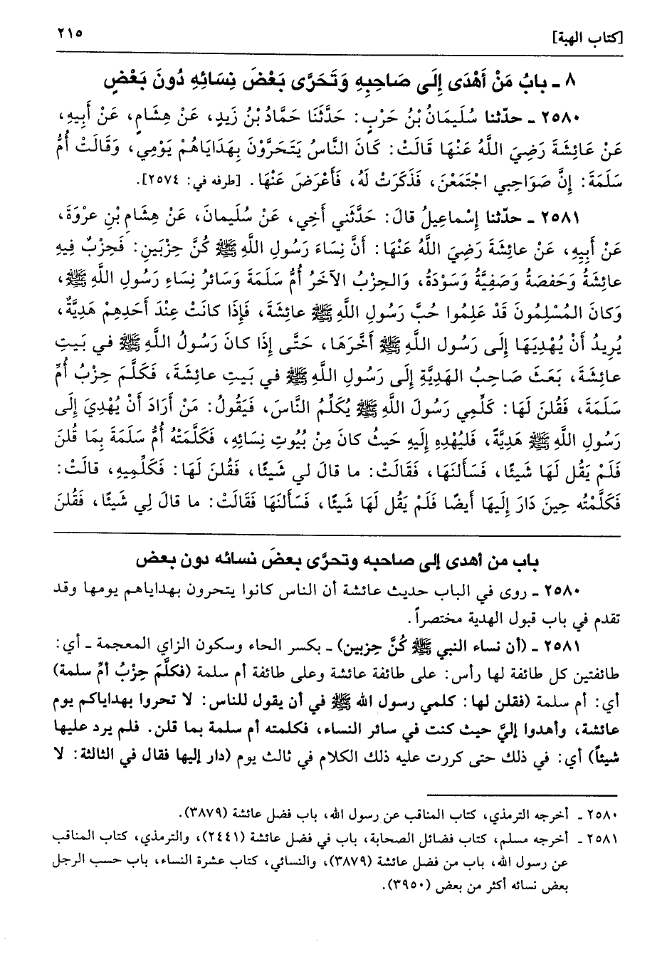 2581 - حَدَّثَنَا إِسْمَاعِيلُ قَالَ حَدَّثَنِى أَخِى عَنْ سُلَيْمَانَ عَنْ هِشَامِ بْنِ عُرْوَةَ عَنْ أَبِيهِ عَنْ عَائِشَةَ - رضى الله عنها - أَنَّ نِسَاءَ رَسُولِ اللَّهِ - صلى الله عليه وسلم - كُنَّ حِزْبَيْنِ فَحِزْبٌ فِيهِ عَائِشَةُ وَحَفْصَةُ وَصَفِيَّةُ وَسَوْدَةُ، وَالْحِزْبُ الآخَرُ أُمُّ سَلَمَةَ وَسَائِرُ نِسَاءِ رَسُولِ اللَّهِ - صلى الله عليه وسلم -، وَكَانَ الْمُسْلِمُونَ قَدْ عَلِمُوا حُبَّ رَسُولِ اللَّهِ - صلى الله عليه وسلم - عَائِشَةَ، فَإِذَا كَانَتْ عِنْدَ أَحَدِهِمْ هَدِيَّةٌ يُرِيدُ أَنْ يُهْدِيَهَا إِلَى رَسُولِ اللَّهِ - صلى الله عليه وسلم - أَخَّرَهَا، حَتَّى إِذَا كَانَ رَسُولُ اللَّهِ - صلى الله عليه وسلم - فِي بَيْتِ عَائِشَةَ بَعَثَ صَاحِبُ الْهَدِيَّةِ إِلَى رَسُولِ اللَّهِ - صلى الله عليه وسلم - فِي بَيْتِ عَائِشَةَ، فَكَلَّمَ حِزْبُ أُمِّ سَلَمَةَ، فَقُلْنَ لَهَا كَلِّمِى رَسُولَ اللَّهِ - صلى الله عليه وسلم - يُكَلِّمُ النَّاسَ، فَيَقُولُ مَنْ أَرَادَ أَنْ يُهْدِىَ إِلَى رَسُولِ اللَّهِ - صلى الله عليه وسلم - هَدِيَّةً فَلْيُهْدِهِ إِلَيْهِ حَيْثُ كَانَ مِنْ بُيُوتِ نِسَائِهِ، فَكَلَّمَتْهُ أُمُّ سَلَمَةَ بِمَا قُلْنَ، فَلَمْ يَقُلْ لَهَا شَيْئًا، فَسَأَلْنَهَا. فَقَالَتْ مَا قَالَ لِى شَيْئًا. فَقُلْنَ