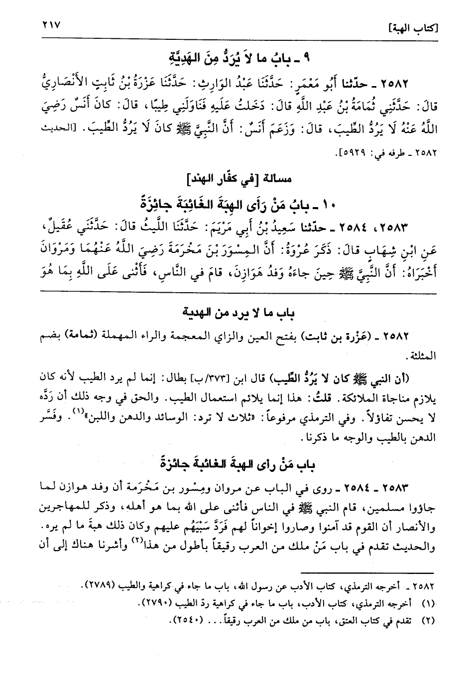 2583 - 2584 - روى في الباب عن مروان ومِسْور بن مَخْرَمة أن وفد هوازن لما جاؤوا مسلمين، قام النبي - صلى الله عليه وسلم - في الناس فأثنى على الله بما هو أهله، وذكر للمهاجرين والأنصار أن القوم قد آمنوا وصاروا إخوانًا لهم فَرَدَّ سَبْيَهُم عليهم وكان ذلك هبةَ ما لم يره. والحديث تقدم في باب مَنْ ملك من العرب رقيقًا بأطول من هذا وأشرنا هناك إلى أن