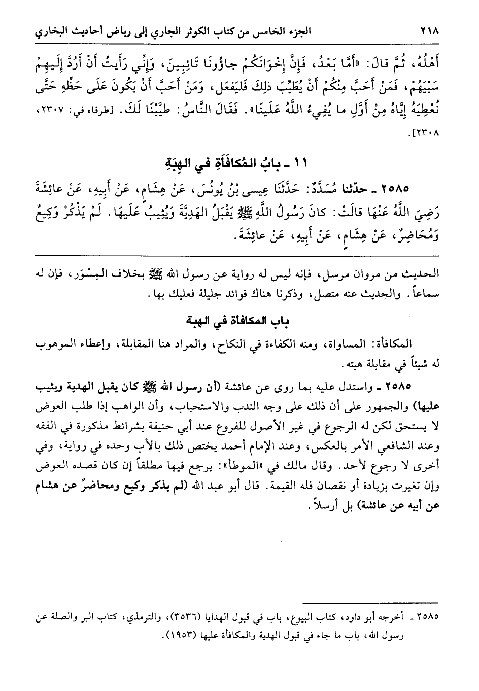 2585 - واستدل عليه بما روى عن عائشة (أن رسول الله - صلى الله عليه وسلم - كان يقبل الهدية ويثيب عليها) والجمهور على أن ذلك على وجه الندب والاستحباب، وأن الواهب إذا طلب العوض لا يستحق لكن له الرجوع في غير الأصول للفروع عند أبي حنيفة بشرائط مذكورة في الفقه وعند الشافعي الأمر بالعكس، وعند الإمام أحمد يختص ذلك بالأب وحده في رواية، وفي أخرى لا رجوع لأحد. وقال مالك في "الموطأ": يرجع فيها مطلقًا إن كان قصده العوض وإن تغيرت بزيادة أو نقصان فله القيمة. قال أبو عبد الله (لم يذكر وكيع ومحاضرٌ عن هشام عن أبيه عن عائشة) بل أرسلًا.