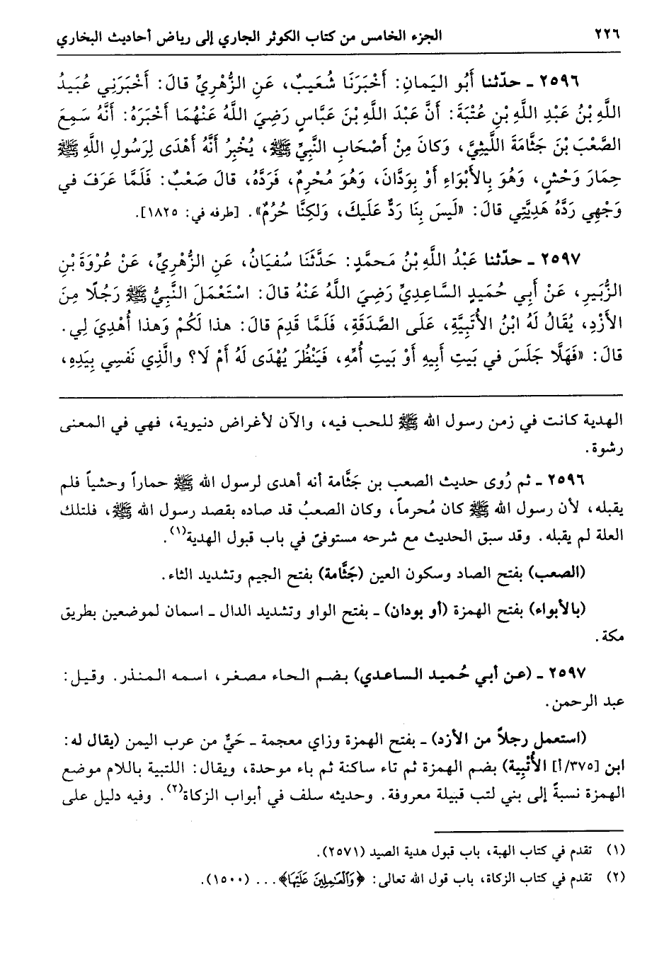 2596 - ثم رُوى حديث الصعب بن جَثَّامة أنه أهدى لرسول الله - صلى الله عليه وسلم - حمارًا وحشيًّا فلم يقبله، لأن رسول الله - صلى الله عليه وسلم - كان مُحرمًا، وكان الصعبُ قد صاده بقصد رسول الله - صلى الله عليه وسلم -، فلتلك العلة لم يقبله. وقد سبق الحديث مع شرحه مستوفىً في باب قبول الهدية.