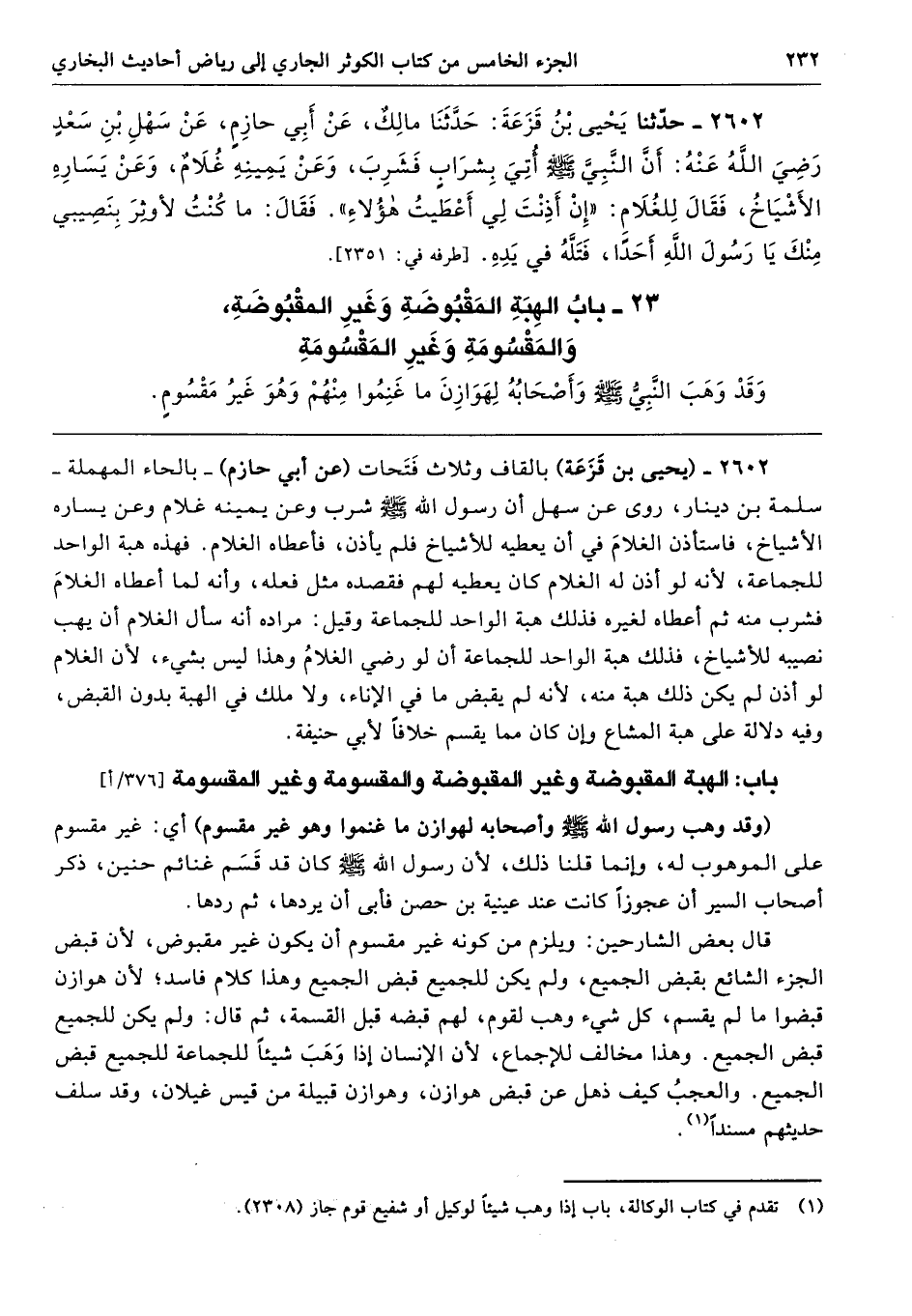 2602 - (يحيى بن قَزَعَة) بالقاف وثلاث فَتَحات (عن أبي حازم) -بالحاء المهملة- سلمة بن دينار، روى عن سهل أن رسول الله - صلى الله عليه وسلم - شرب وعن يمينه غلام وعن يساره الأشياخ، فاستأذن الغلامَ في أن يعطيه للأشياخ فلم يأذن، فأعطاه الغلام. فهذه هبة الواحد للجماعة، لأنه لو أذن له الغلام كان يعطيه لهم فقصده مثل فعله، وأنه لما أعطاه الغلامَ فشرب منه ثم أعطاه لغيره فذلك هبة الواحد للجماعة وقيل: مراده أنه سأل الغلام أن يهب نصيبه للأشياخ، فذلك هبة الواحد للجماعة أن لو رضي الغلامُ وهذا ليس بشيء، لأن الغلام لو أذن لم يكن ذلك هبة منه، لأنه لم يقبض ما في الإناء، ولا ملك في الهبة بدون القبض، وفيه دلالة على هبة المشاع وإن كان مما يقسم خلافًا لأبي حنيفة.
