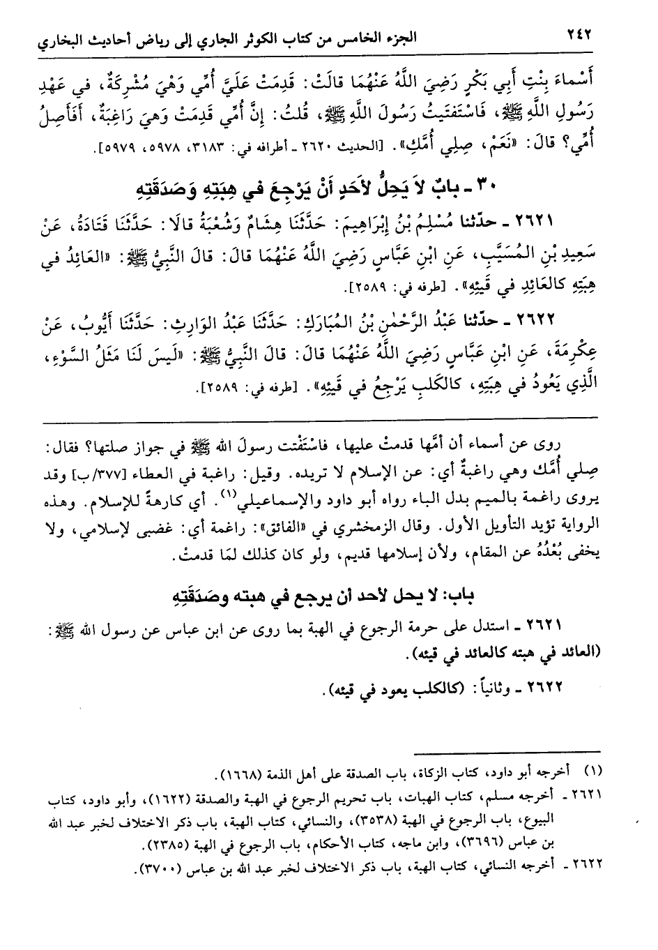 2621 - استدل على حرمة الرجوع في الهبة بما روى عن ابن عباس عن رسول الله - صلى الله عليه وسلم -: (العائد في هبته كالعائد في قيئه).