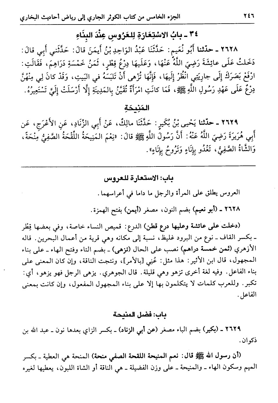 2629 - حَدَّثَنَا يَحْيَى بْنُ بُكَيْرٍ حَدَّثَنَا مَالِكٌ عَنْ أَبِى الزِّنَادِ عَنِ الأَعْرَجِ عَنْ أَبِى هُرَيْرَةَ - رضى الله عنه - أَنَّ رَسُولَ اللَّهِ - صلى الله عليه وسلم - قَالَ «نِعْمَ الْمَنِيحَةُ اللِّقْحَةُ الصَّفِىُّ مِنْحَةً، وَالشَّاةُ الصَّفِىُّ تَغْدُو بِإِنَاءٍ وَتَرُوحُ بِإِنَاءٍ».