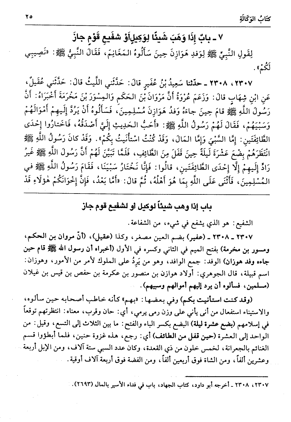 2307 - 2308 - (عفير) بضم العين مصغر، وكذا (عقيل)، (أنّ مروان بن الحكم، ومسور بن مخرمة) بفتح الميم في الثاني وكسره في الأول (أخبراه أن رسول الله -صَلَّى الله عَلَيْهِ وَسَلَّمَ- قام حين جاءه وفد هوزان) الوفد: جمع الوافد، وهو من يَرِدْ على الملوك لأمر من الأمور، وهوزان: اسم قبيلة، قال الجوهري: أولاد هوازن بن منصور بن عكرمة بن حفص بن قيس بن غيلان (مسلمين، فسألوه أن يرد إليهم أموالهم وسبيهم).