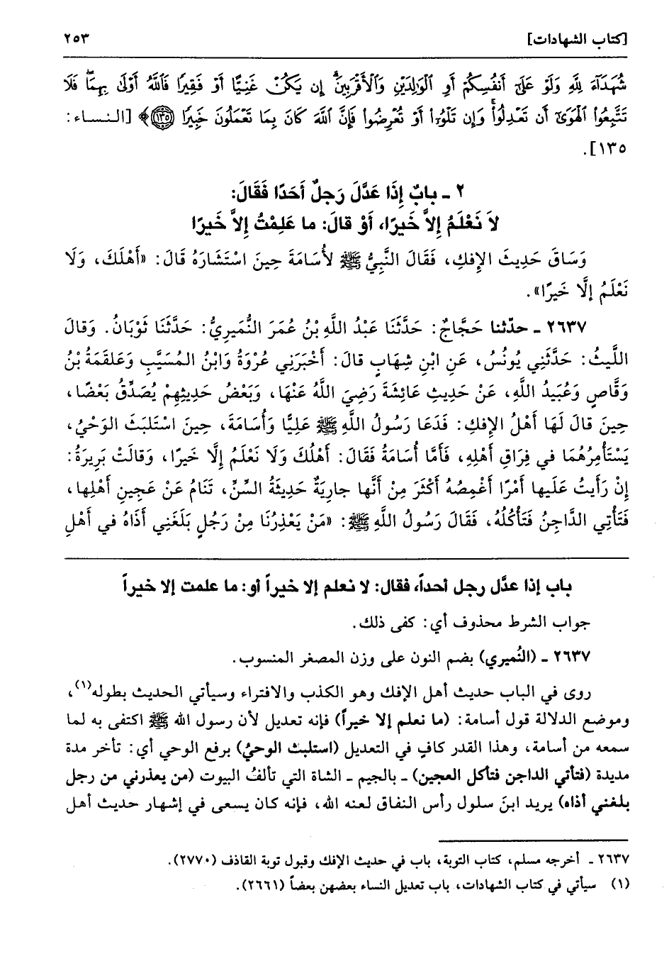 روى في الباب حديث أهل الإفك وهو الكذب والافتراء وسيأتي الحديث بطوله، وموضع الدلالة قول أسامة: (ما نعلم إلا خيرًا) فإنه تعديل لأن رسول الله - صلى الله عليه وسلم - اكتفى به لما سمعه من أسامة، وهذا القدر كافٍ في التعديل (استلبث الوحيُ) برفع الوحي أي: تأخر مدة مديدة (فتأتي الداجن فتأكل العجين) -بالجيم- الشاة التي تألفُ البيوت (من يعذرني من رجل بلغني أذاه) يريد ابنَ سلول رأس النفاق لعنه الله، فإنه كان يسعى في إشهار حديث أهل