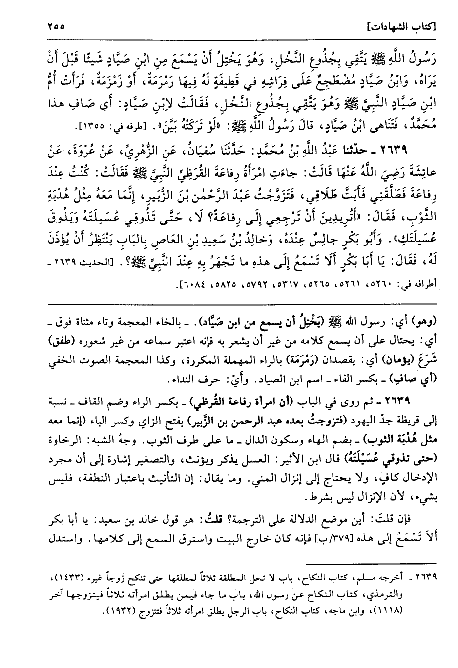 2639 - ثم روى في الباب (أن امرأة رفاعة القُرظي) -بكسر الراء وضم القاف- نسبة إلى قريظة جدّ اليهود (فتزوجتُ بعده عبد الرحمن بن الزَّبير) بفتح الزاي وكسر الباء (إنما معه مثل هُدْبَهْ الثوب) -بضم الهاء وسكون الدال- ما على طرف الثوب. وجهُ الشبه: الرخاوة (حتى تذوقي عُسَيْلَتَهُ) قال ابن الأثير: العسل يذكر ويؤنث، والتصغير إشارة إلى أن مجرد الإدخال كافٍ، ولا يحتاج إلى إنزال المني. وما يقال: إن التأنيث باعتبار النطفة، فليس بشيء، لأن الإنزال ليس بشرط.