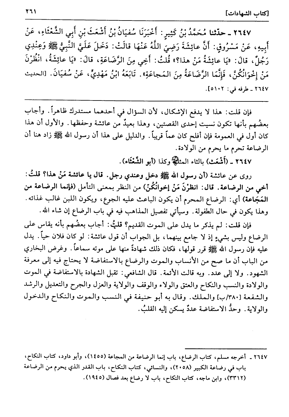 2647 - حَدَّثَنَا مُحَمَّدُ بْنُ كَثِيرٍ أَخْبَرَنَا سُفْيَانُ عَنْ أَشْعَثَ بْنِ أَبِى الشَّعْثَاءِ عَنْ أَبِيهِ عَنْ مَسْرُوقٍ أَنَّ عَائِشَةَ - رضى الله عنها - قَالَتْ دَخَلَ عَلَىَّ النَّبِىُّ - صلى الله عليه وسلم - وَعِنْدِى رَجُلٌ، قَالَ «يَا عَائِشَةُ مَنْ هَذَا». قُلْتُ أَخِى مِنَ الرَّضَاعَةِ. قَالَ «يَا عَائِشَةُ، انْظُرْنَ مَنْ إِخْوَانُكُنَّ، فَإِنَّمَا الرَّضَاعَةُ مِنَ الْمَجَاعَةِ». تَابَعَهُ ابْنُ مَهْدِىٍّ عَنْ سُفْيَانَ. طرفه 5102