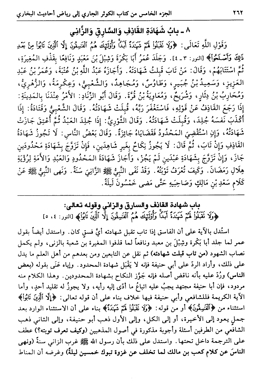باب شهادة القاذف والسارق والزاني وقوله تعالى: {وَلَا تَقْبَلُوا لَهُمْ شَهَادَةً أَبَدًا وَأُولَئِكَ هُمُ الْفَاسِقُونَ إِلَّا الَّذِينَ تَابُوا} [النور:4، 5]