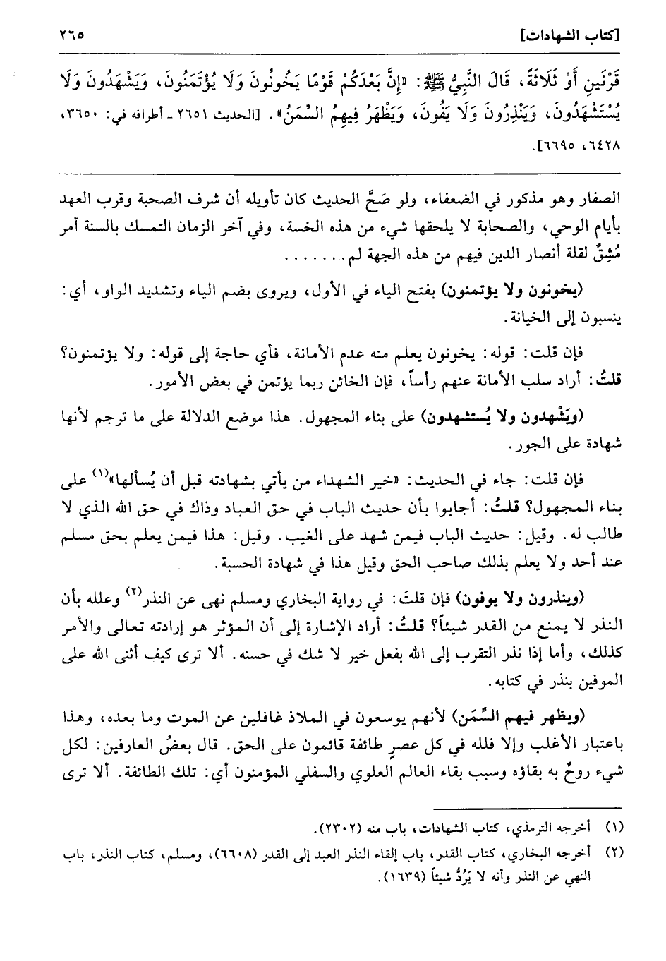 قَرْنَيْنِ أَوْ ثَلاَثَةً. قَالَ النَّبِىُّ - صلى الله عليه وسلم - «إِنَّ بَعْدَكُمْ قَوْمًا يَخُونُونَ وَلاَ يُؤْتَمَنُونَ، وَيَشْهَدُونَ، وَلاَ يُسْتَشْهَدُونَ وَيَنْذِرُونَ وَلاَ يَفُونَ، وَيَظْهَرُ فِيهِمُ السِّمَنُ». أطرافه 3650، 6428، 6695