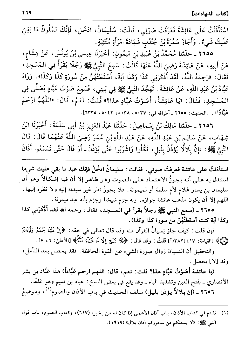 2655 - حَدَّثَنَا مُحَمَّدُ بْنُ عُبَيْدِ بْنِ مَيْمُونٍ أَخْبَرَنَا عِيسَى بْنُ يُونُسَ عَنْ هِشَامٍ عَنْ أَبِيهِ عَنْ عَائِشَةَ - رضى الله عنها - قَالَتْ سَمِعَ النَّبِىُّ - صلى الله عليه وسلم - رَجُلاً يَقْرَأُ فِي الْمَسْجِدِ فَقَالَ «رَحِمَهُ اللَّهُ، لَقَدْ أَذْكَرَنِى كَذَا وَكَذَا آيَةً، أَسْقَطْتُهُنَّ مِنْ سُورَةِ كَذَا وَكَذَا». وَزَادَ عَبَّادُ بْنُ عَبْدِ اللَّهِ عَنْ عَائِشَةَ تَهَجَّدَ النَّبِىُّ - صلى الله عليه وسلم - فِي بَيْتِى فَسَمِعَ صَوْتَ عَبَّادٍ يُصَلِّى فِي الْمَسْجِدِ فَقَالَ «يَا عَائِشَةُ، أَصَوْتُ عَبَّادٍ هَذَا». قُلْتُ نَعَمْ. قَالَ «اللَّهُمَّ ارْحَمْ عَبَّادًا». أطرافه 5037، 5038، 5042، 6335