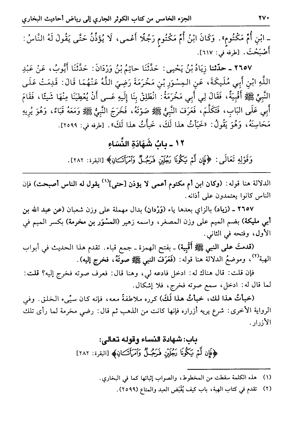 2657 - (زياد) بالزاي بعدها ياء (وَرْدان) بدال مهملة على وزن شعبان (عن عبد الله بن أبي مليكة) بضم الميم على وزن المصغر، واسمه زهير (المسْوَر بن مخرمة) بكسر الميم في الأول، وفتحه في الثاني.