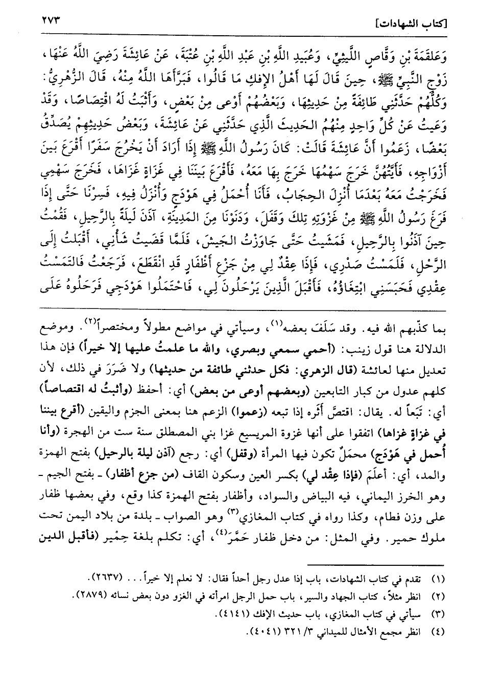 بما كذّبهم الله فيه. وقد سَلَفَ بعضه، وسيأتي في مواضع مطولًا ومختصرًا. وموضع الدلالة هنا قول زينب: (أحمي سمعي وبصري، والله ما علمتُ عليها إلا خيرًا) فإن هذا تعديل منها لعائشة (قال الزهري: فكل حدثني طائفة من حديثها) ولا ضَرَرَ في ذلك، لأن كلهم عدول من كبار التابعين (وبعضهم أوعى من بعض) أي: أحفظ (وأثبتُ له اقتصاصًا) أي: تَبَعًا له. يقال: اقتصَّ أَثَره إذا تبعه (زعموا) الزعم هنا بمعنى الجزم واليقين (أقرع بيننا في غزاةٍ غزاها) اتفقوا على أنها غزوة المريسيع غزابني المصطلق سنة ست من الهجرة (وأنا أُحمل في هَوْدَج) محمَلٌ تكون فيها المرأة (وقفل) أي: رجع (آذن ليلة بالرحيل) بفتح الهمزة والمد، أي: أعلَمَ (فإذا عِقْد لي) بكسر العين وسكون القاف (من جزع أظفار) -بفتح الجيم- وهو الخرز اليماني، فيه البياض والسواد، وأظفار بفتح الهمزة كذا وقع، وفي بعضها ظفار على وزن فطام، وكذا رواه في كتاب المغازي وهو الصواب -بلدة من بلاد اليمن تحت ملوك حمير. وفي المثل: من دخل ظفار حَمَّرَ، أي: تكلم بلغة حِمْير (فأقبل الدين